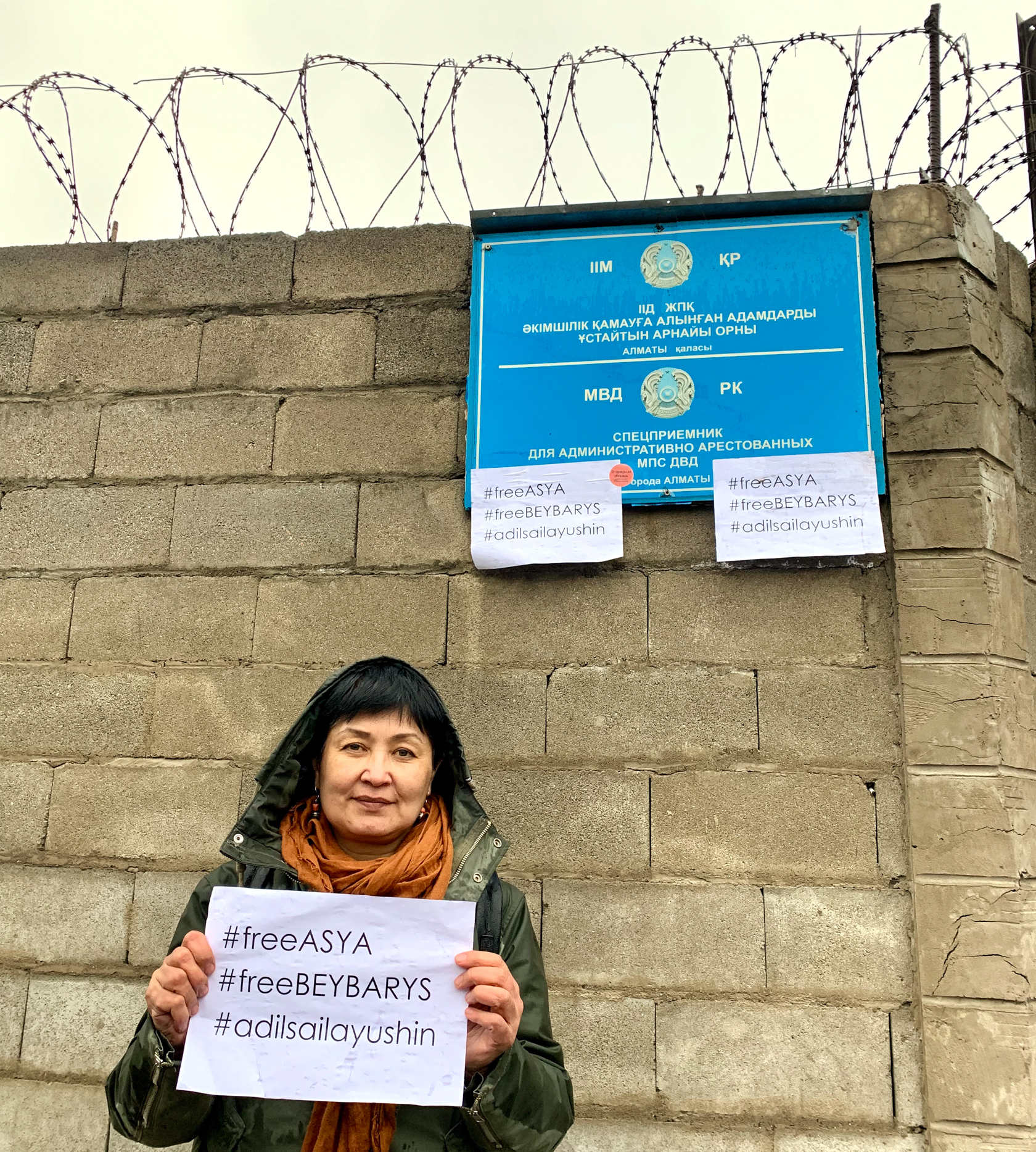 Май 2019 года. Жанар Джандосова у спецприемника, где на тот момент находились под арестом Ася Тулесова и Бейбарыс Толымбеков за акцию «От правды не убежишь»