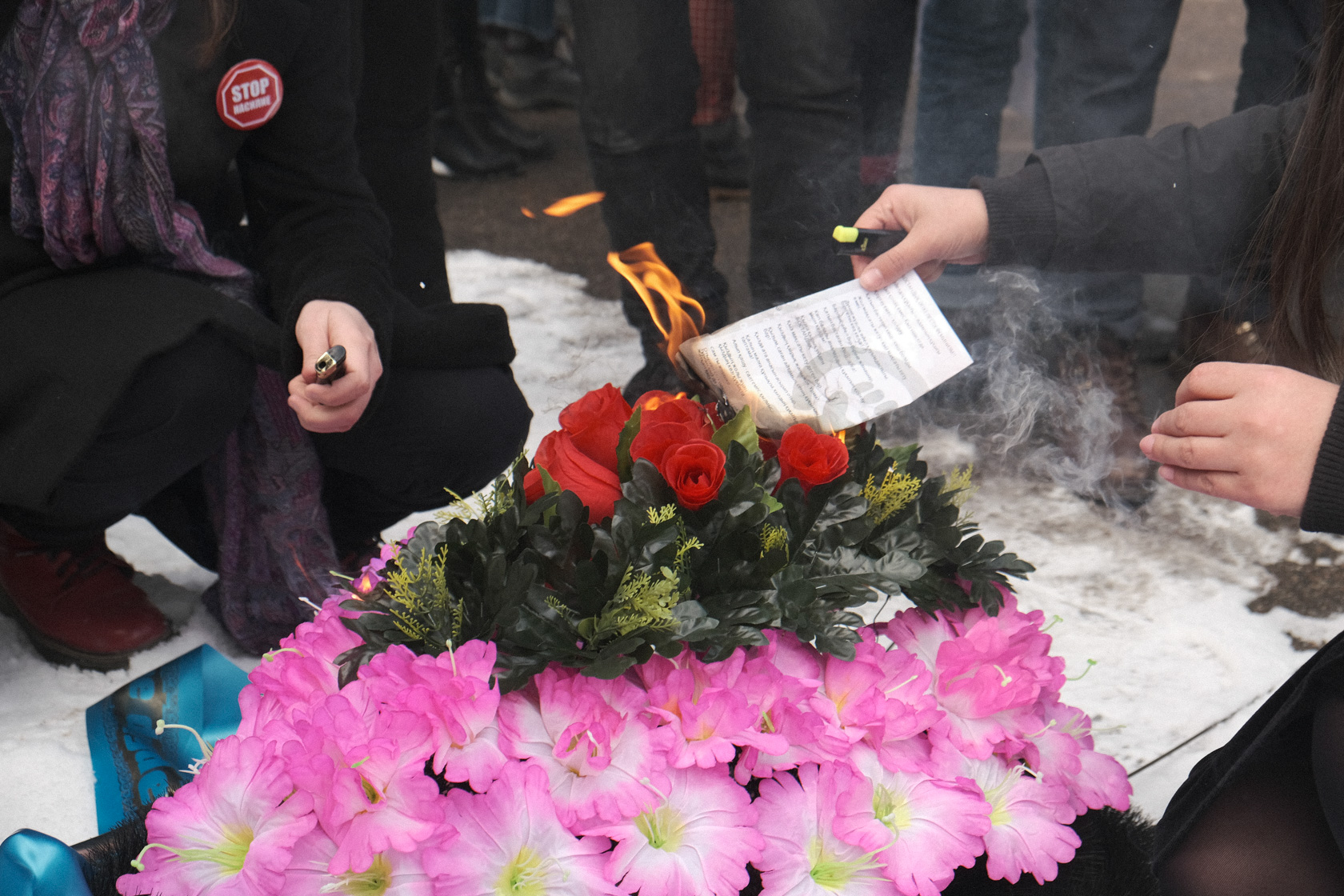Безопасность — это базовая потребность каждого человека, и именно ее мы лишены. Бытовое насилие происходит за закрытыми дверями домов и квартир, и от него умирает больше 400 женщин в год. Именно поэтому мы сжигаем этот венок с цветами рядом с жилыми домами, где, возможно, прямо сейчас какая-то женщина терпит побои и не знает, к кому обратиться за помощью. Сожжением венка мы хотим донести, что в этот день, восьмого марта, мы требуем соблюдения наших прав, а не цветов раз в году. Ведь во все остальные дни года женщины терпят систематическое насилие.