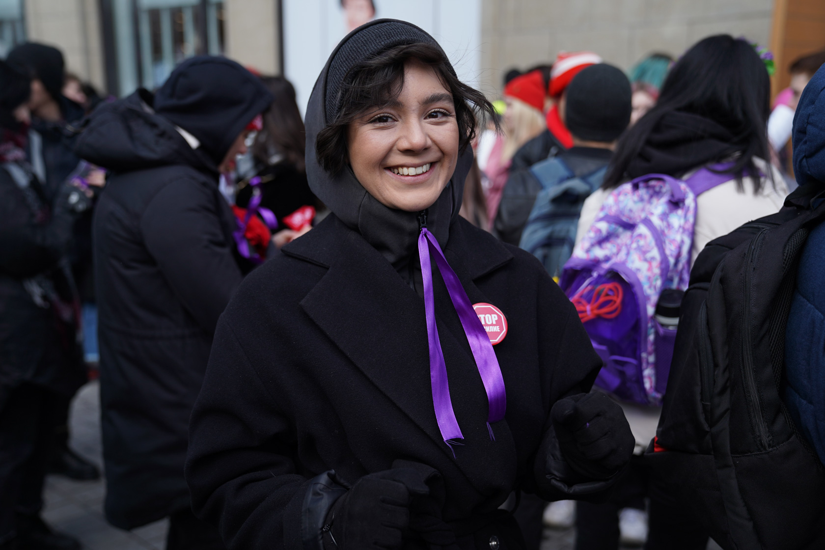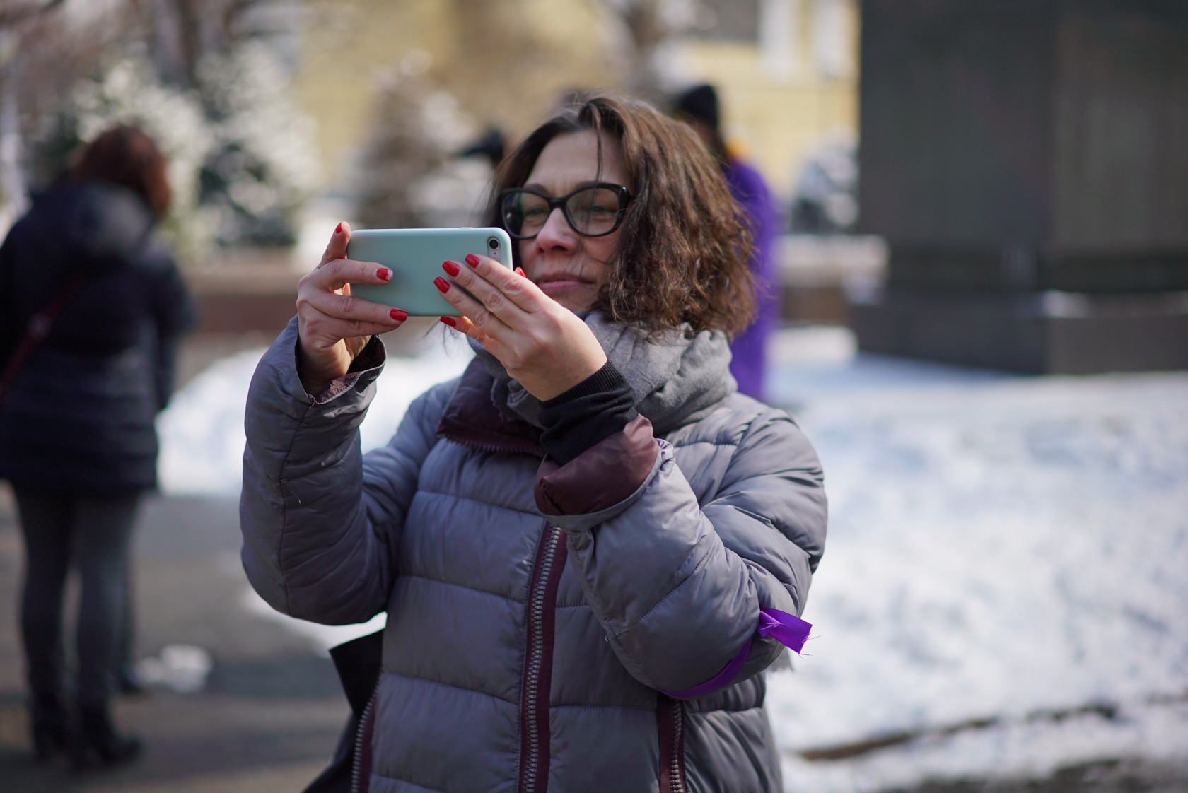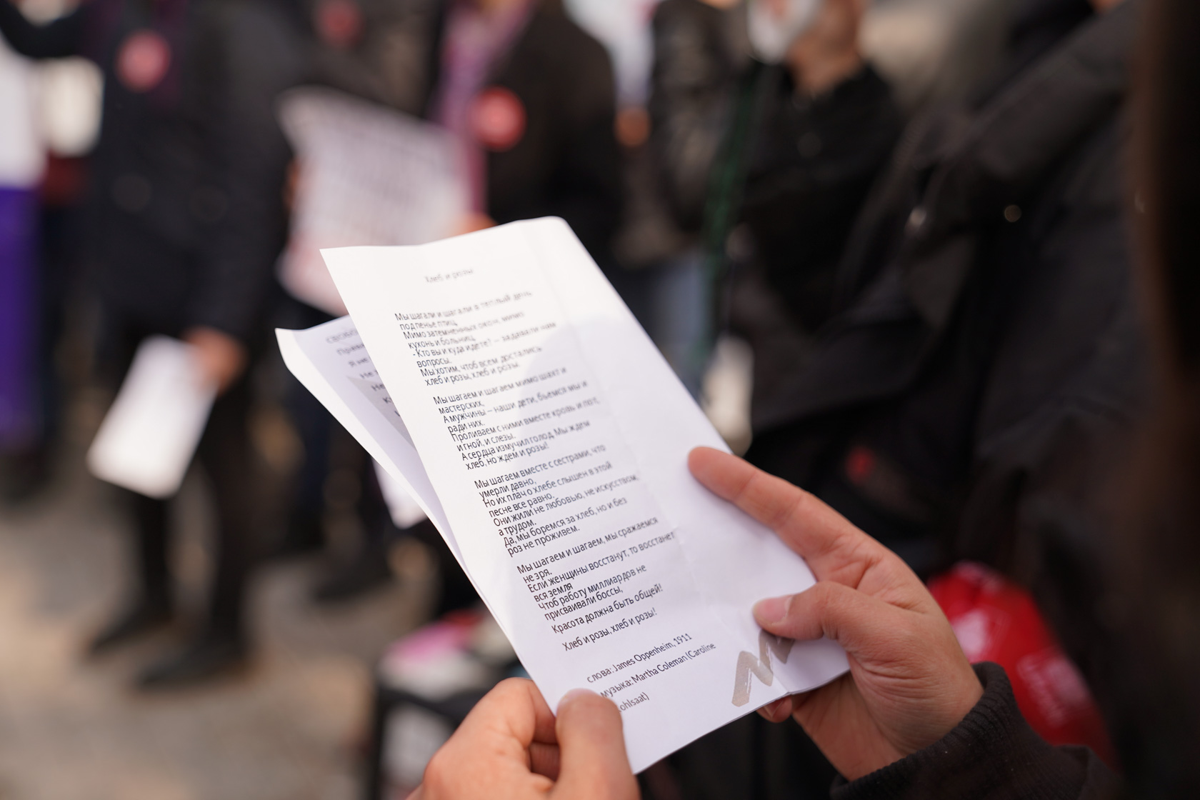 На пересечении улиц Панфилова и Кабанбай батыра колонна остановилась, чтобы хором исполнить песню Джуди Коллинз «Хлеб и розы», ставшую своеобразным гимном феминизма.