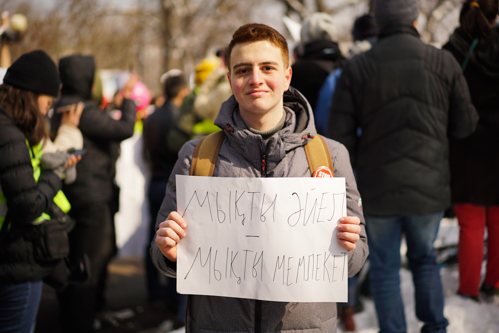 Участницы марша несли плакаты с требованиями и слоганами и хором скандировали лозунги на русском и казахском языках: