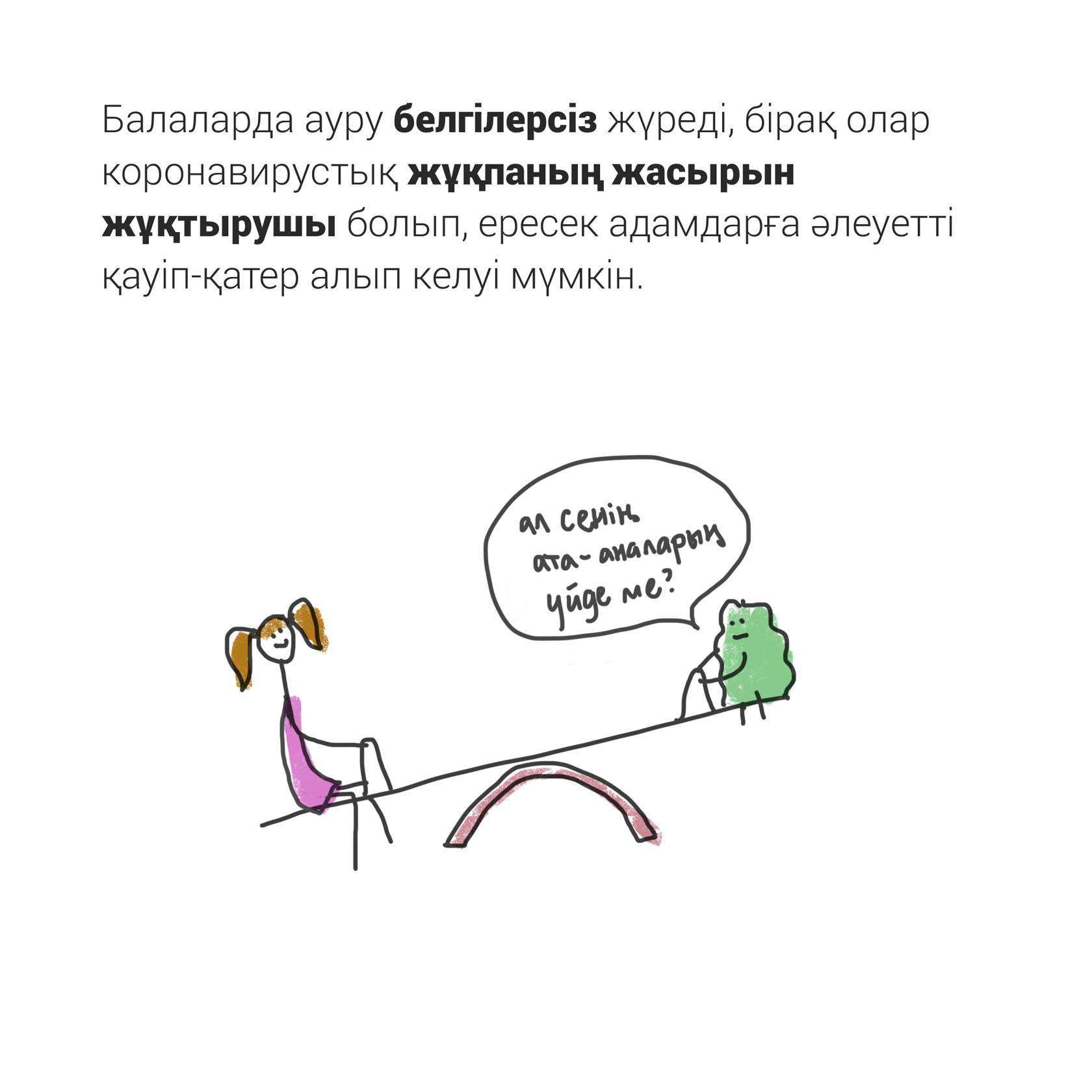 Балалаларда ауру симптомсыз жүреді, бірақ олар коронавирус инфекциясын жасырын тасымалдаушы болып ересектерге потенциялды қауіп төндіруі мүмкін.