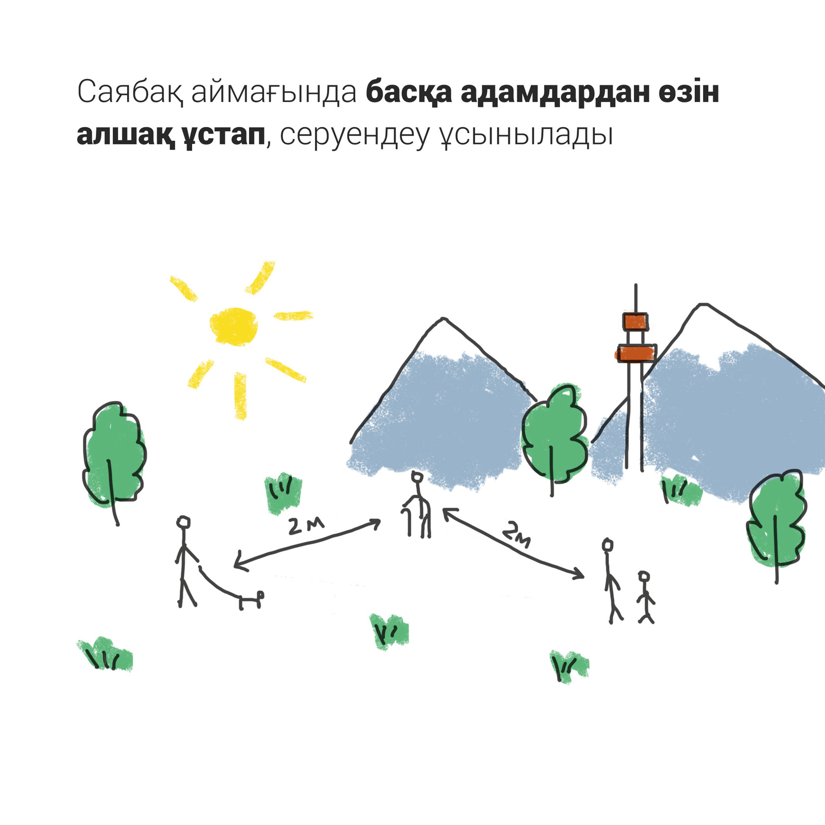 • Таза ауада серуендеуге саябақ аумағын таңдаған дұрыс. Өзге адамдармен 2-3 метр арақашықтықты сақтау керек. Аттракциондар мен балалар алаңына бармау қажет.