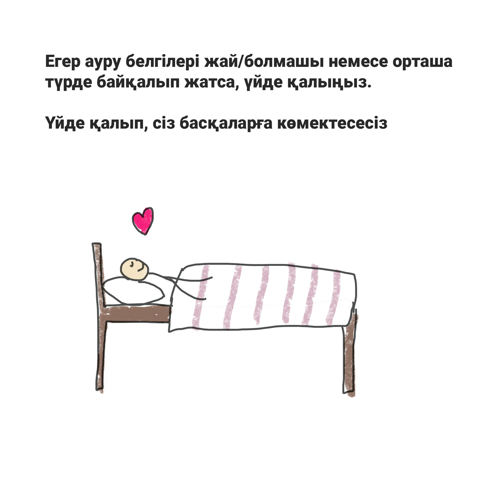 Бұл жағдайда сіз үйде отыру арқылы аурудың басқаларға, әсіресе ауыр хәлде жатқан науқастарға қызмет көрсететін денсаулық сақтау қызметкерлеріне жұғып кету мүмкіндігін азайтасыз. Сіз үйде қалып өзгелерге көмектесе аласыз.
