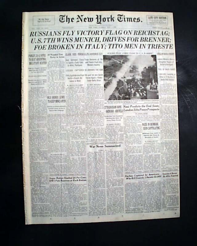 1 мамыр 1945 жыл New York Times басты бетіндегі мақала «Рейхстаг төбесінде Жеңіс туы желбіреп тұр» деген ақпаратпен жарияланады.