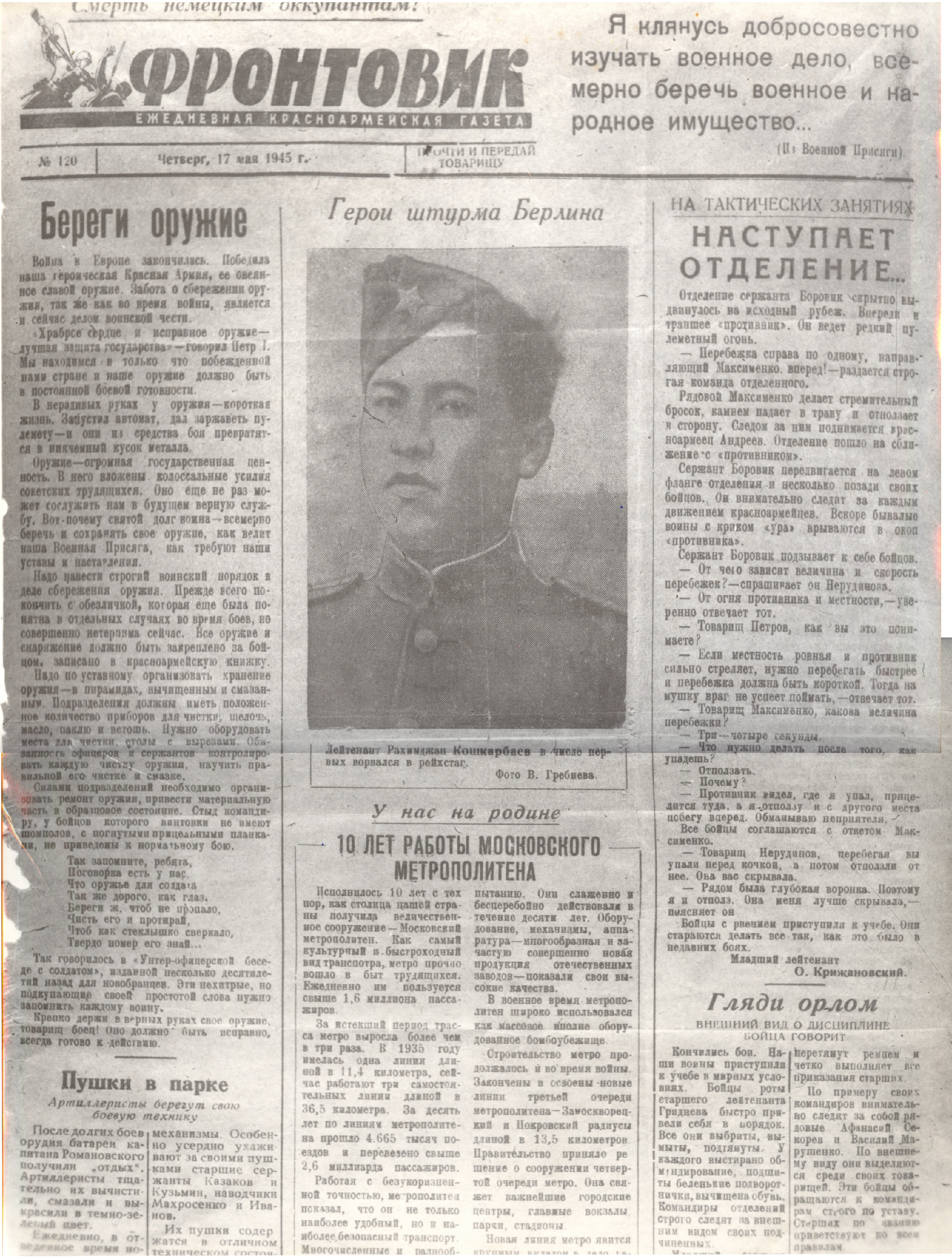 «30 сәуір 1945 жыл… Таңғы сағат төрт пен бестің арасында қараңғылық әлі сейілмеген еді. Айналамызда снарядтар мен миналар жарылып, танкілердің гүрілі құлақ тұндырады. Көшені қалың шаң мен түтін жапқан. Жүру өте қиын. Қарсы бетте пулеметтен оқ жаудырып жатқандықтан ғимараттың ішіне (Үшінші Рейхтің Ішкі істер министрлігі — Е) есігі немесе терезесі арқылы бірден кіру мүмкін емес. Ғимараттың дәл алдына келгенде оқ кілт тоқтады. Бәріміз тыншып қалдық. Қиын жағдайдан танкистер құтқарды. Ғимараттың бір қабырғасына оқ атып, жарып берді. Дәл осы саңылауға қарша оқ жаудырдық… Жауынгерлердің сол сәттегі қуанышын суреттеу қиын еді. Себебі ғимаратты басып алу жоспарының алғашқы қадамы ретінде сегіз қабатты ғимараттың бір бөлмесін басып алған едік…