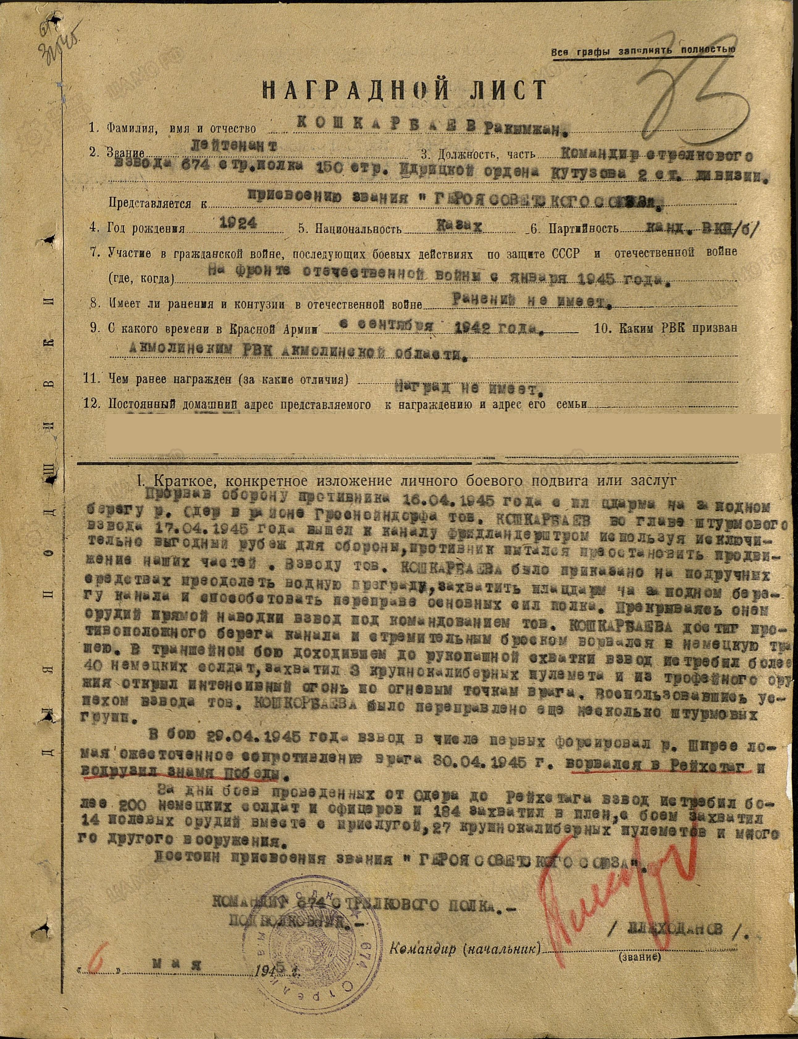 Арықтың жағасындағы қауіптен сескеніп қарсы бетке шықтық. Рейхстаг бізден енді үш жүздей метр алдымызда тұр. Өзен бойындағы атыс екі жақтан да үдей түсті. Әрі қарай жылжу мүмкін емес еді. 20-30 минуттай өтті. Қозғалыссыз отырмыз. Қызыл туды алып шығып, химиялық қарындашпен «674» деп полк нөмірін және «Булатов, Кошкарбаев» деп фамилияларымызды жаздым. Маған қарап отырған Булатов: