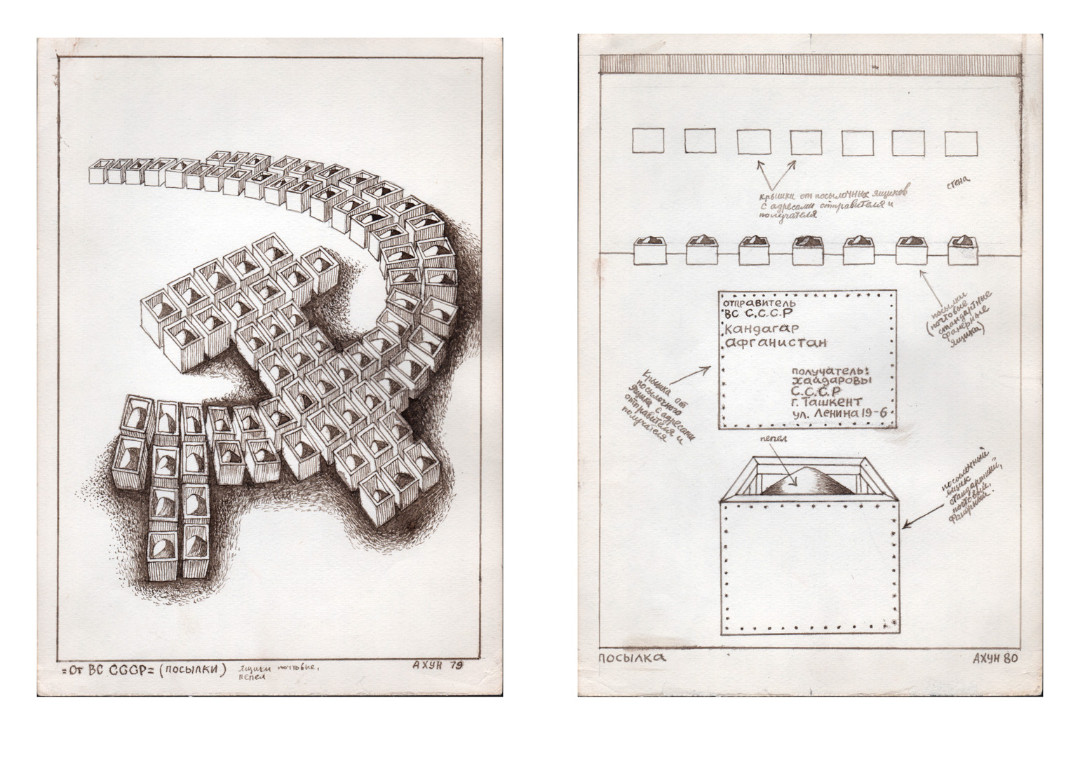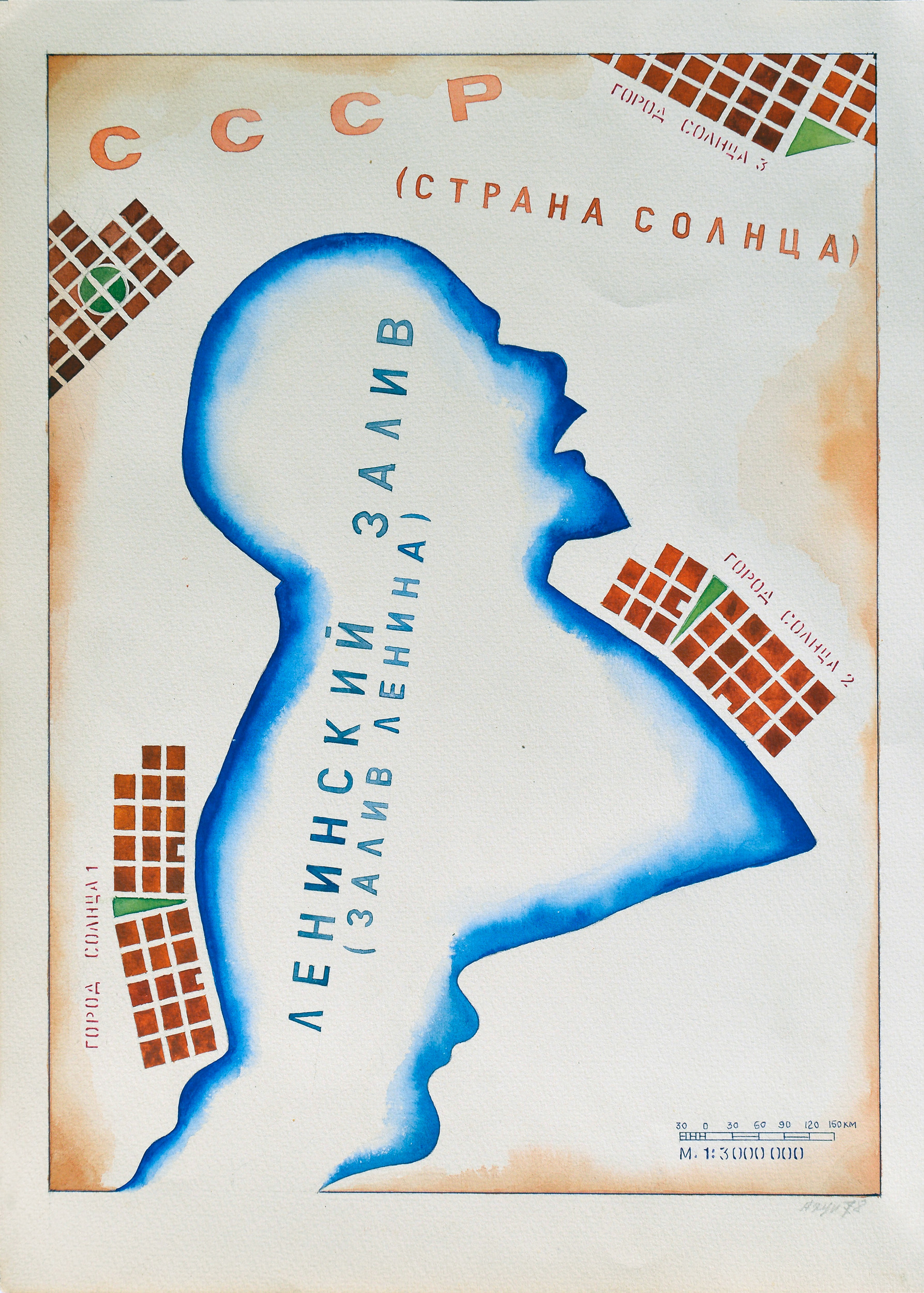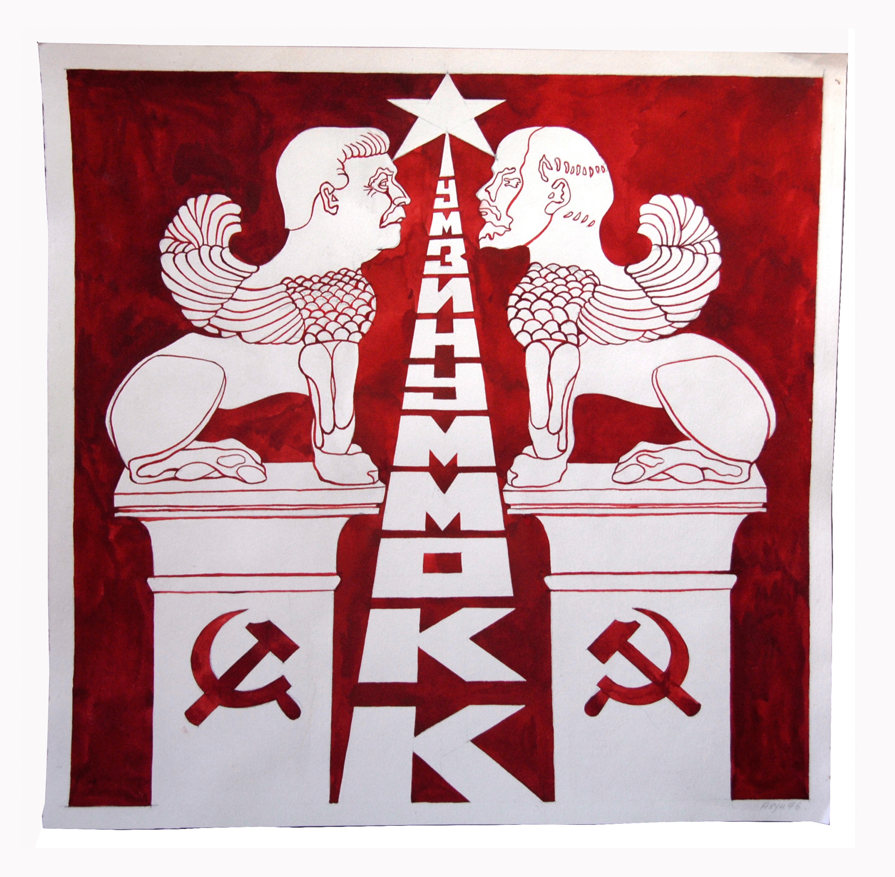 Потом была другая серия. Я в детстве много ездил с отцом, жили в музее — все это сидело и потом неожиданно проявилось уже в творчестве. Я представил, что через тысячи лет археологи будут копать и найдут неизвестную культуру: обнаружат ее обломки и артефакты. И этот неизвестный пласт культуры будет называться «социолит». Был неолит, палеолит, а здесь — социолит. И они будут раскапывать керамические фрагменты «Слава КПСС», какие-то сосуды, на них — Ленин. Я начал все это рисовать и формировать археологическую коллекцию из рисунков. Рисовал эскизы найденных оссуариев. Оссуарий — это такой сосуд для костей. Я рисовал оссуарий в виде Кремля, мавзолея Ленина, кремлевских башен…