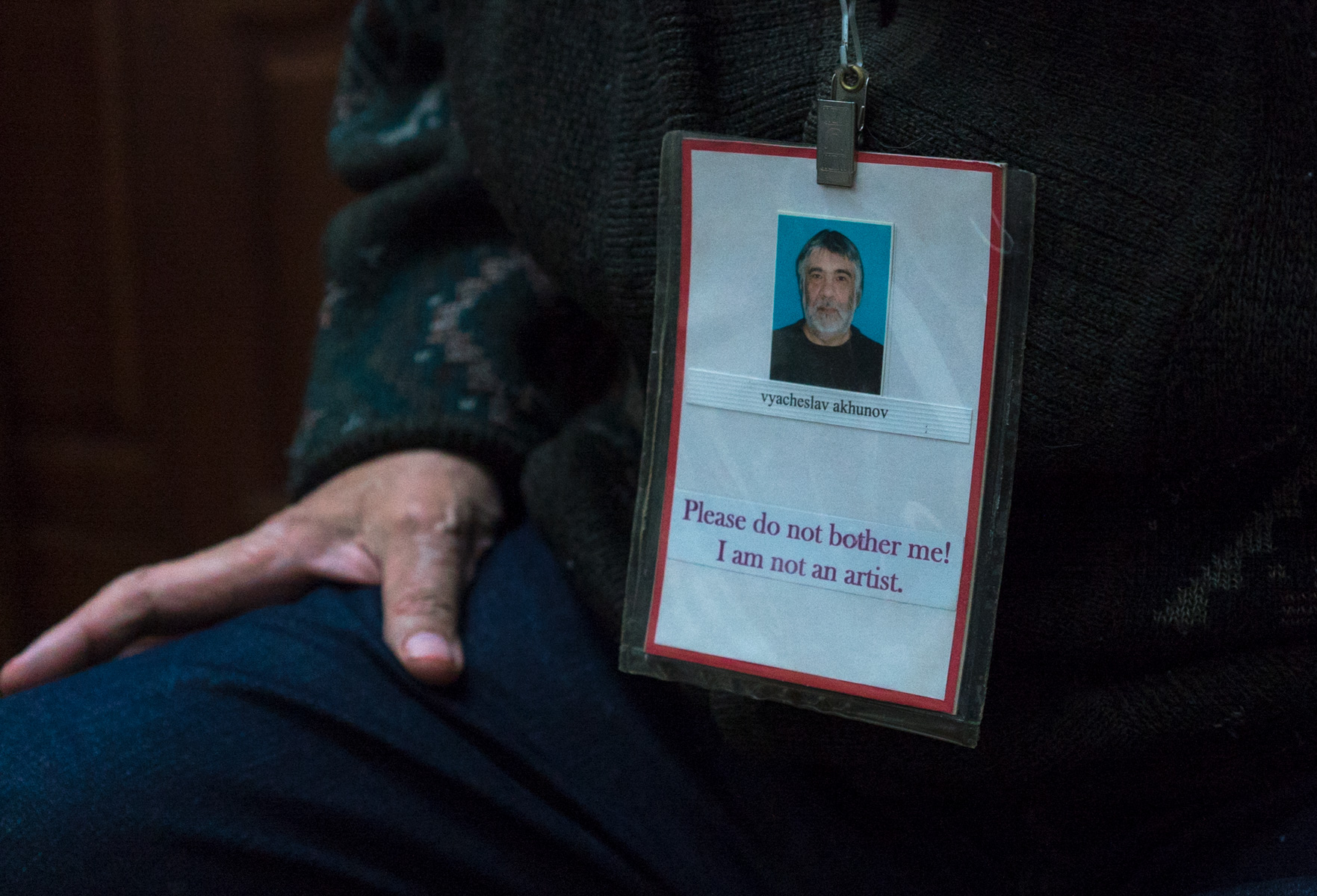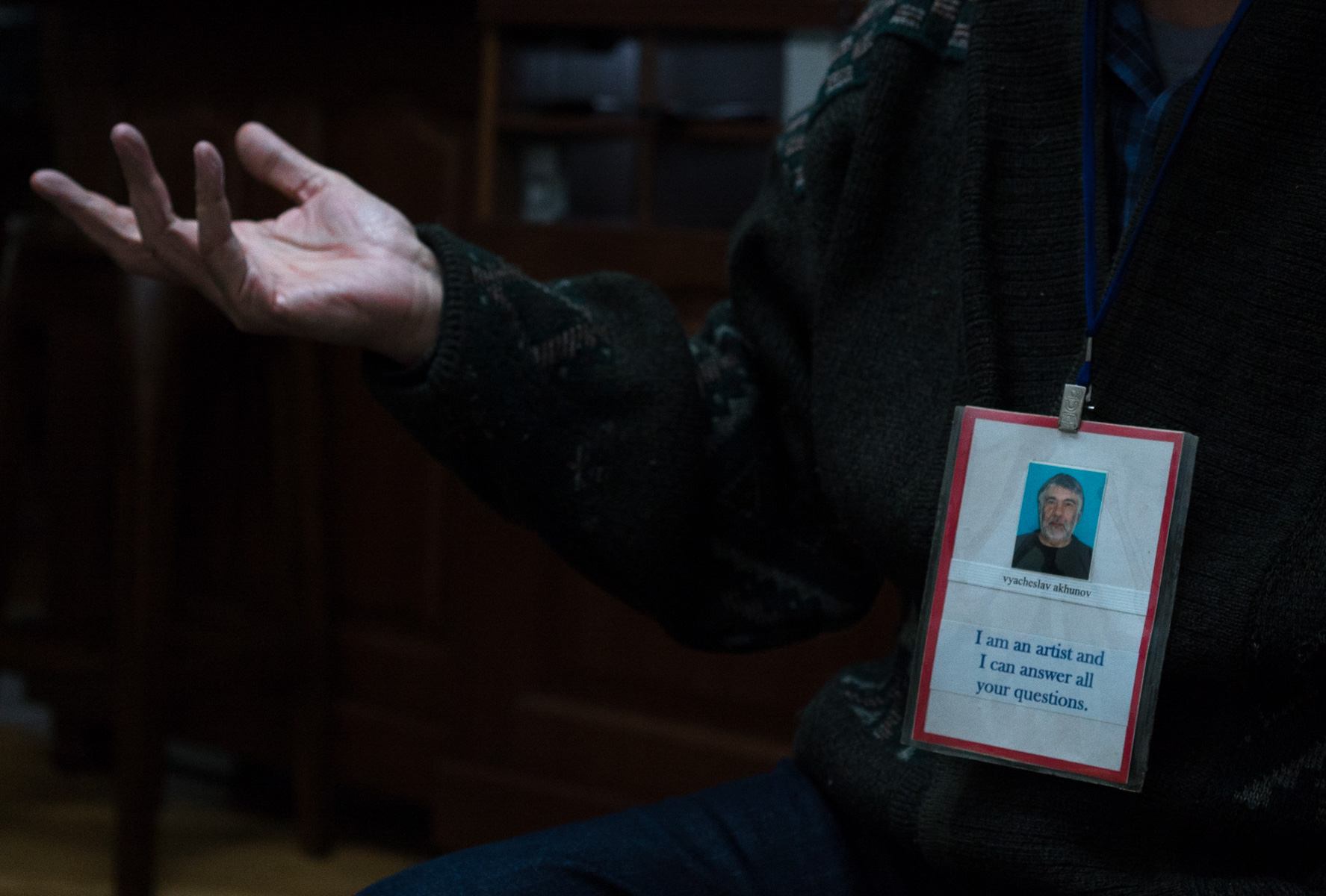 Несколько лет назад здесь было одно биеннале, которое называлось «Территория искусства». И как обычно, на этом биеннале ни одной работы социальной направленности. И я тогда сделал перформанс. Я сделал себе самодельный бейджик с надписью «Прошу не беспокоить! Я не художник.». Я ходил по выставочному залу и говорил: «Не обращайте внимания, я не художник, потому что я не считаю этот выставочный зал территорией искусства. Здесь нет искусства». Это была моя позиция, мой перформанс.