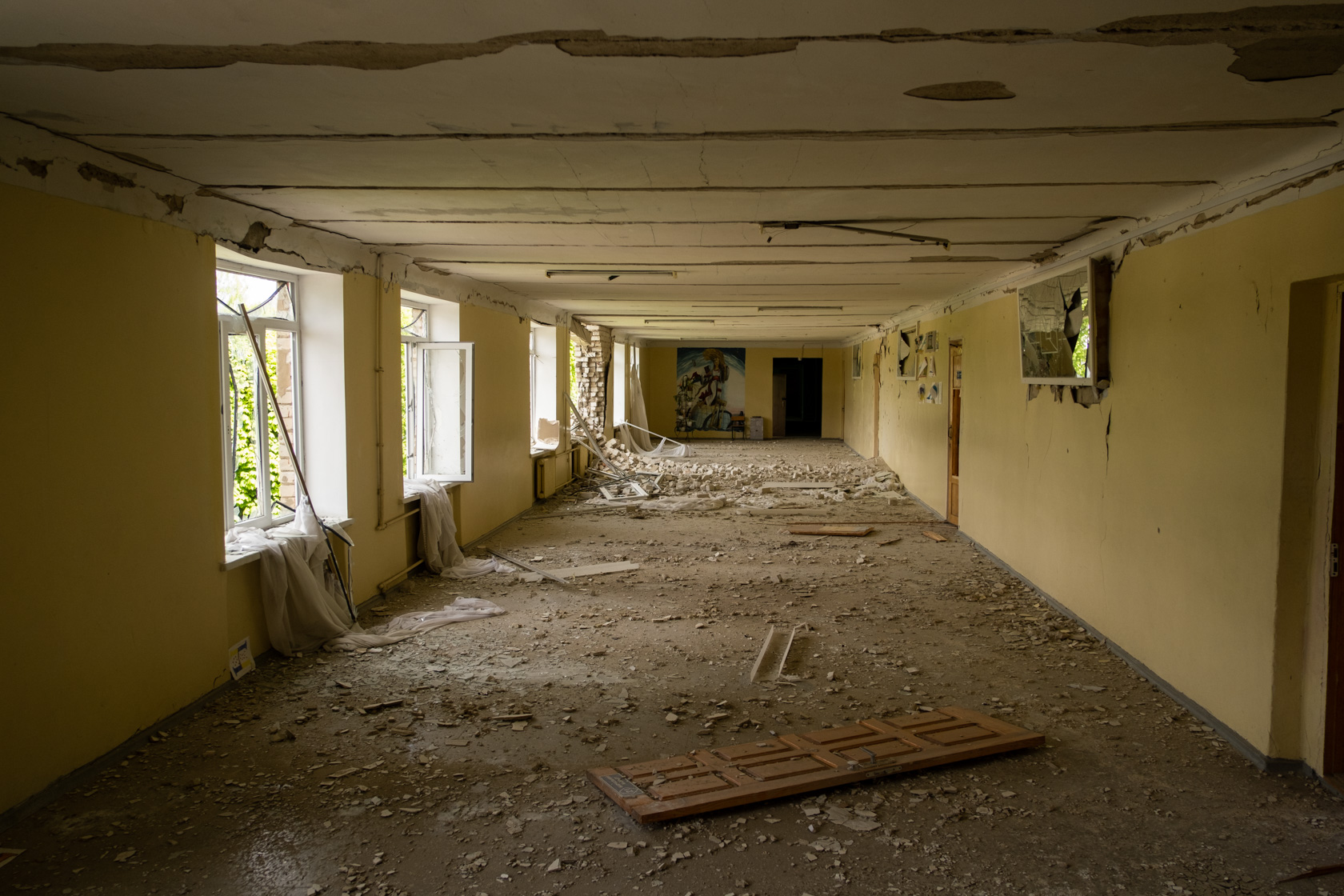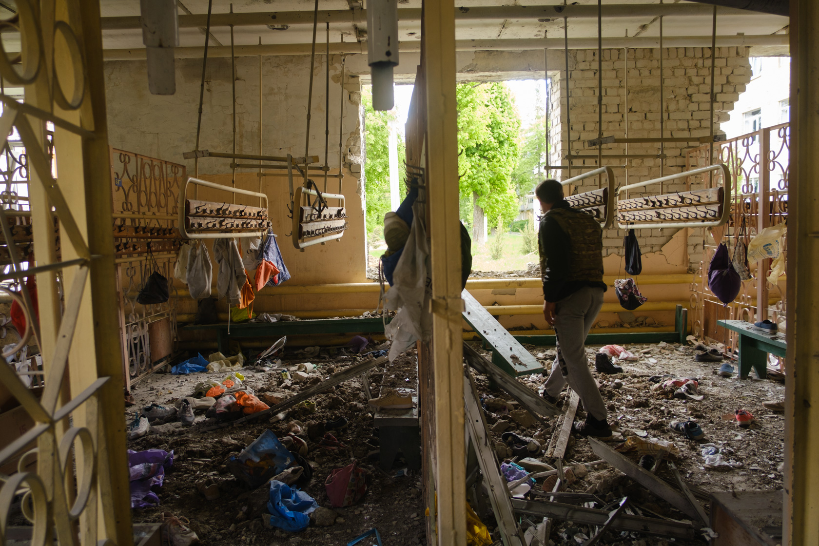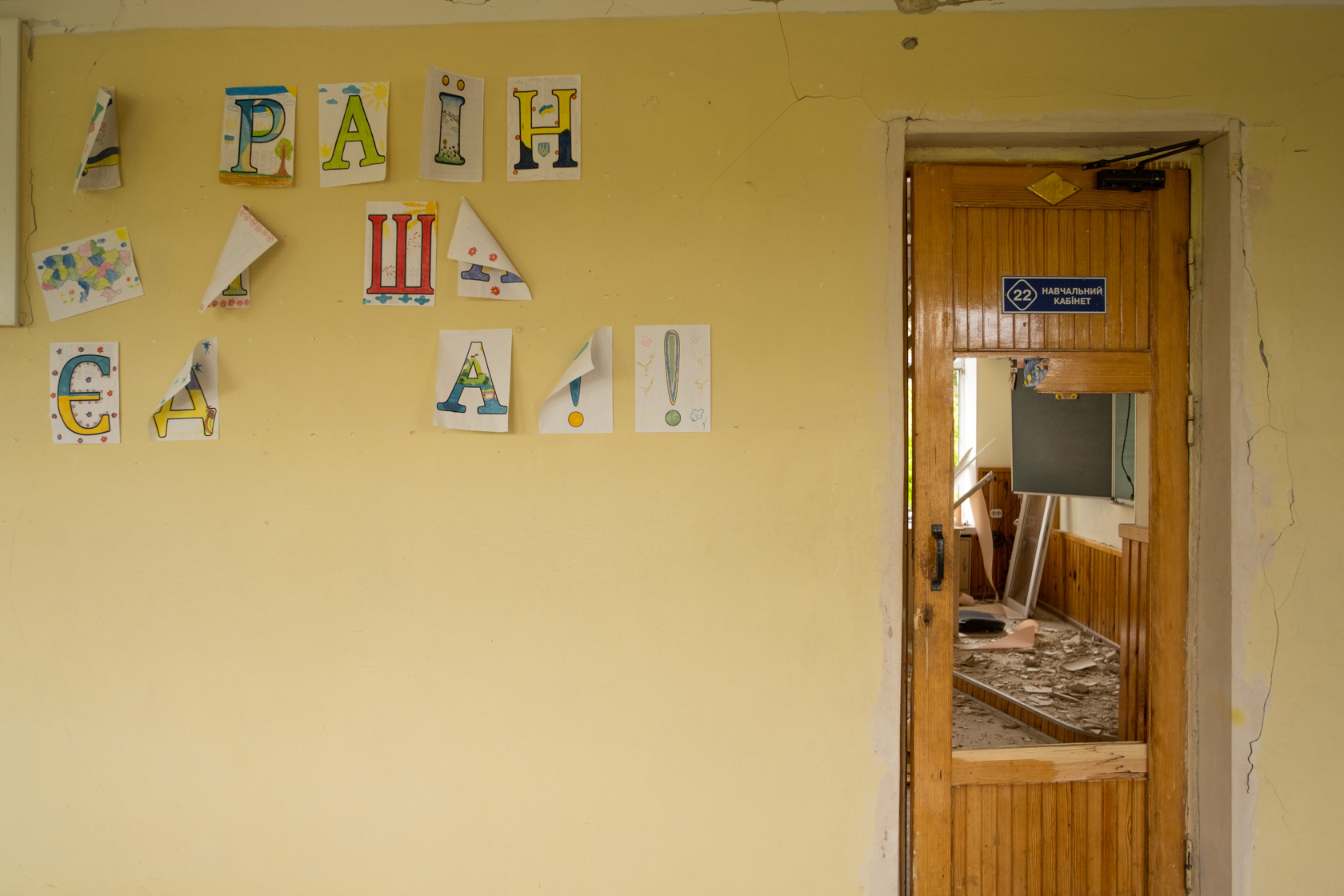 Волонтеры Сергей и Виталий проводят нас по коридорам школы: до войны это была одна из лучших школ в Харькове. Началась война, и по школе ударили российские артиллерийские снаряды. Зайдя в раздевалку, Сергей находит розовую спортивную сумочку своего ребенка.