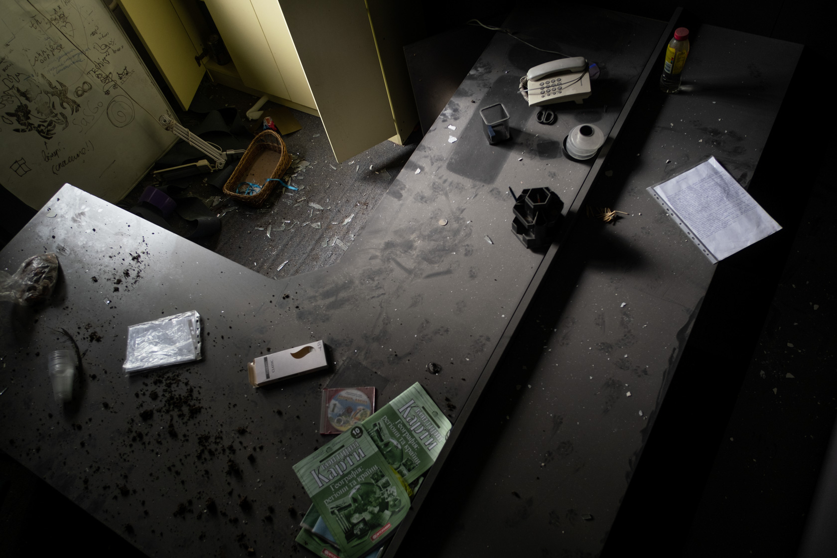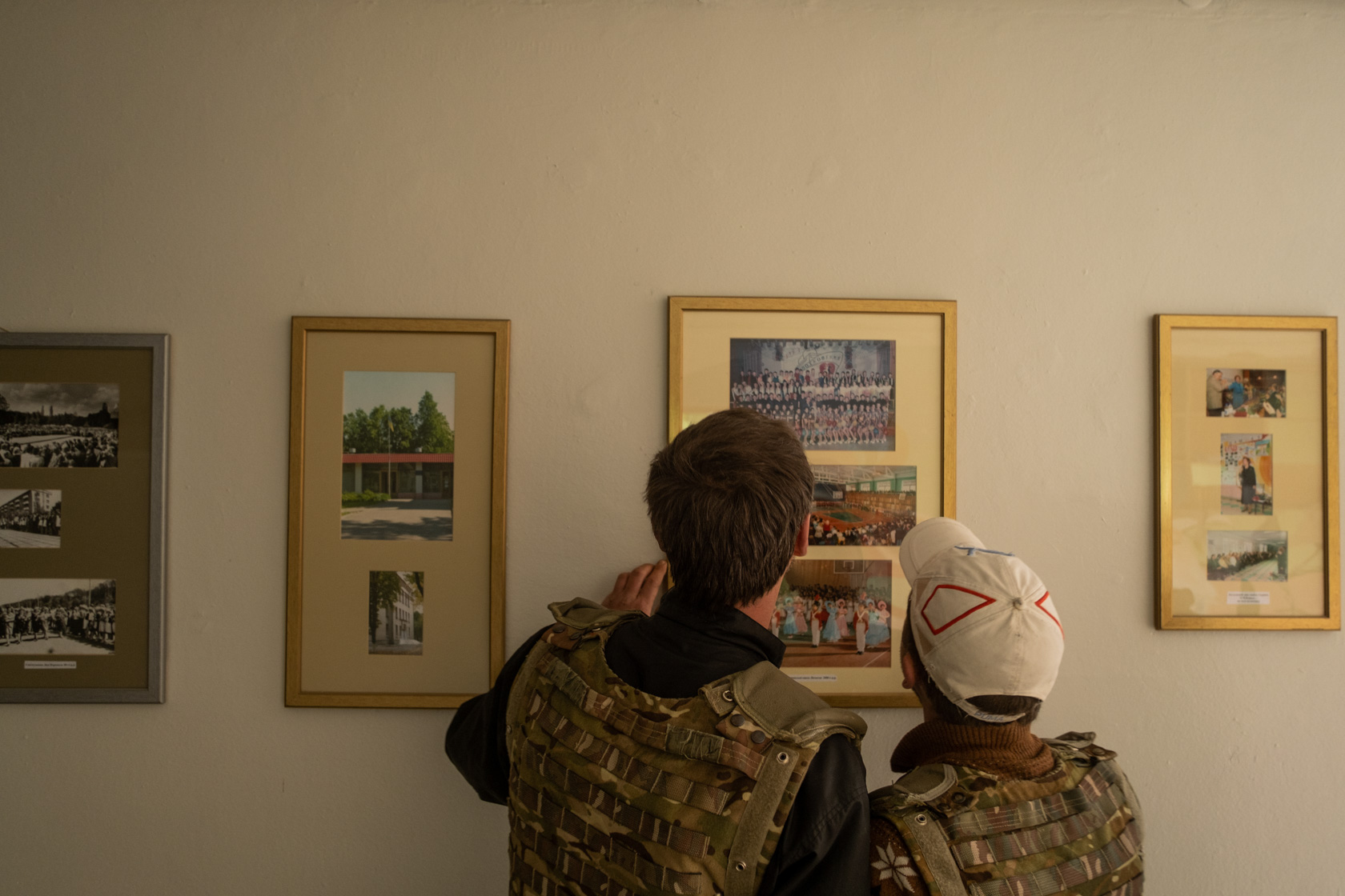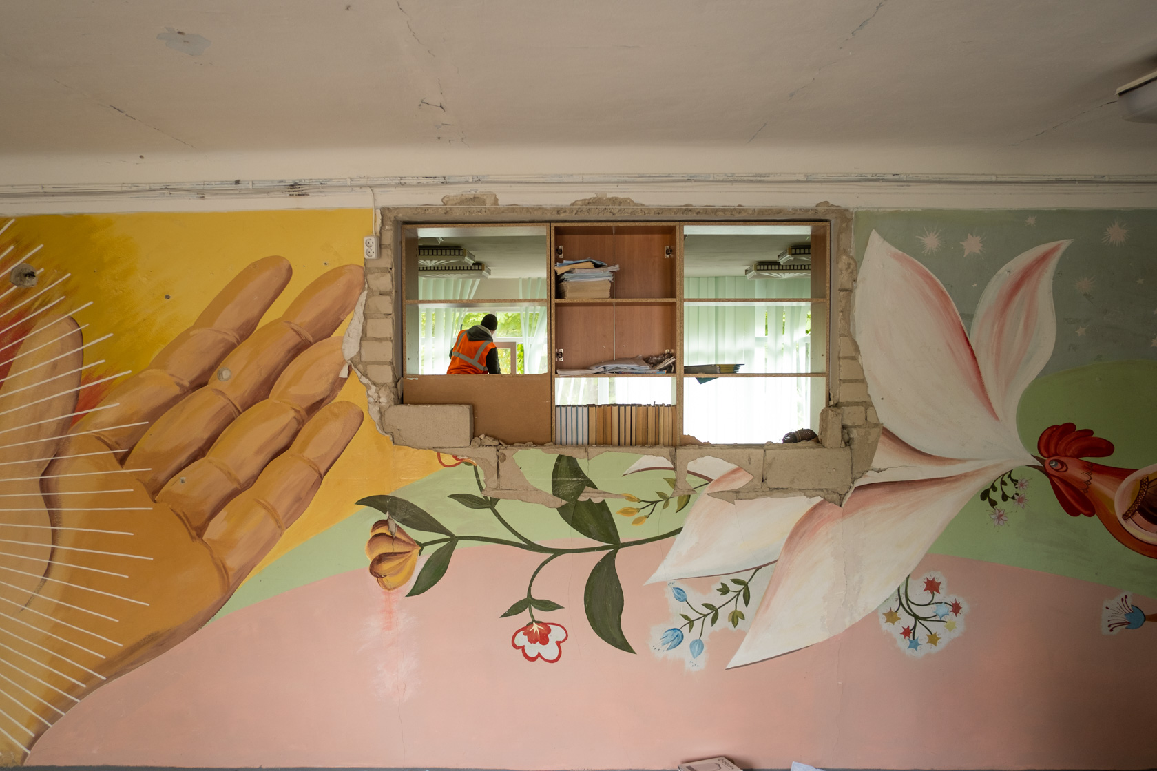 Волонтеры Сергей и Виталий проводят нас по коридорам школы: до войны это была одна из лучших школ в Харькове. Началась война, и по школе ударили российские артиллерийские снаряды. Зайдя в раздевалку, Сергей находит розовую спортивную сумочку своего ребенка.