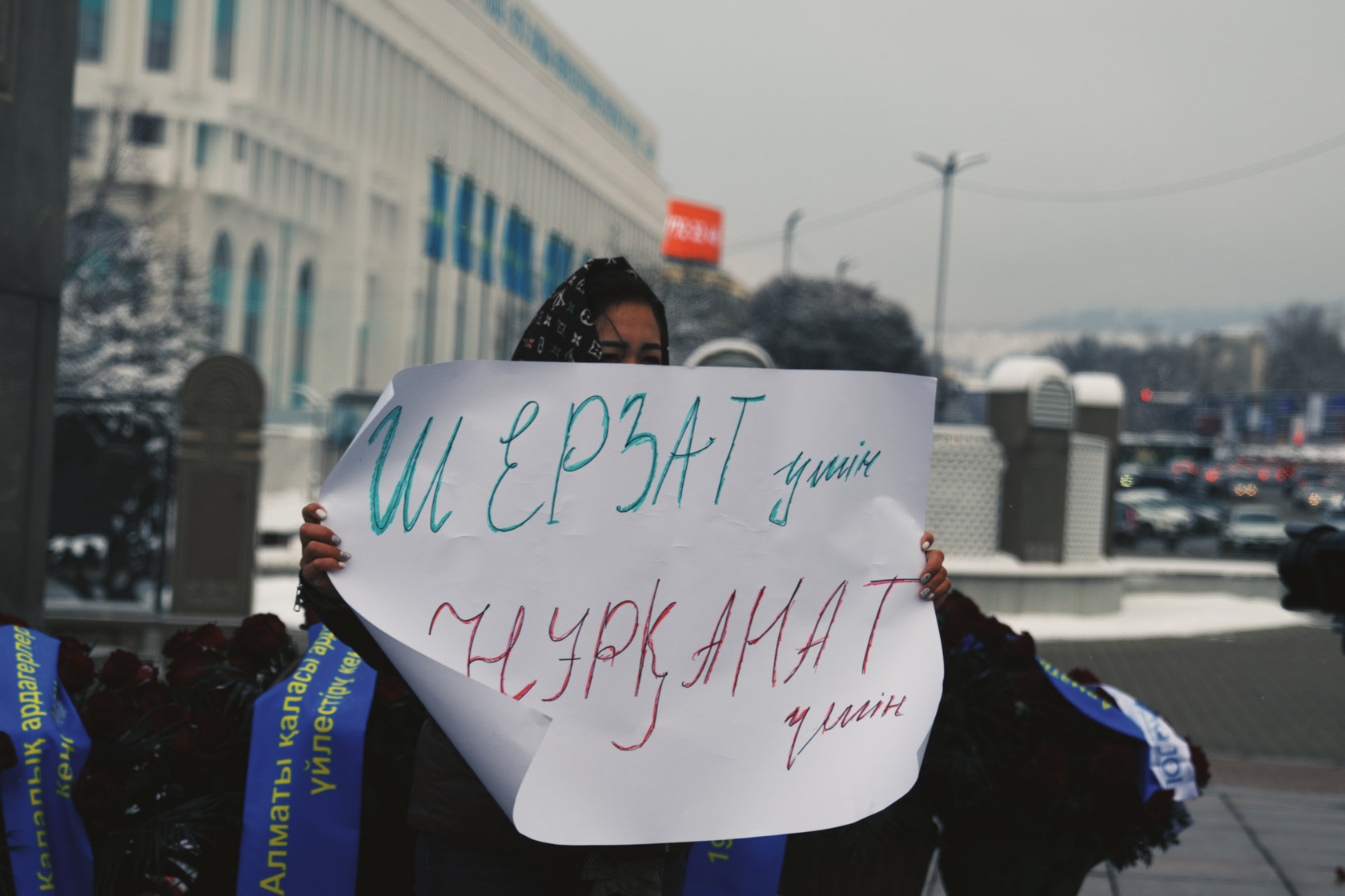 Девушка держит плакат с именами погибших жителей Талгара — 16-летнего подростка Шерзата Болата и его дяди Нурканата Гайыпбаева.