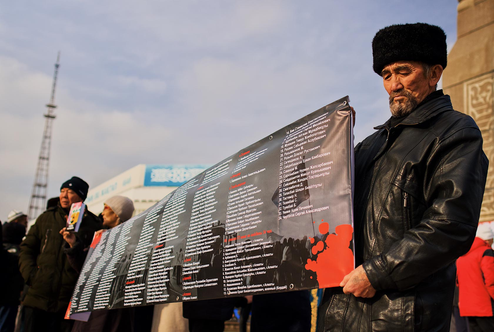 Гражданская акция памяти погибших и жертв пыток в период Қанды Қаңтар («Кровавого января») 2022 г. На плакате — имена и фотографии людей, убитых в разных городах Казахстана в январе 2022 года.