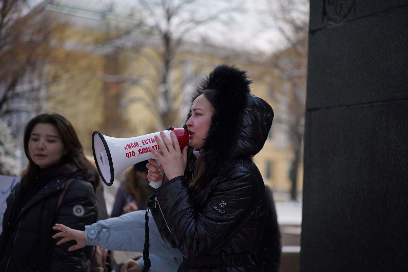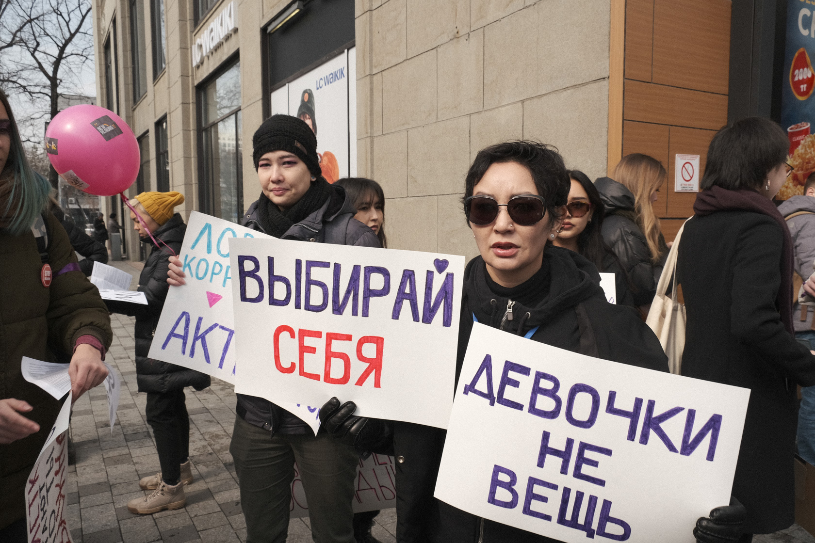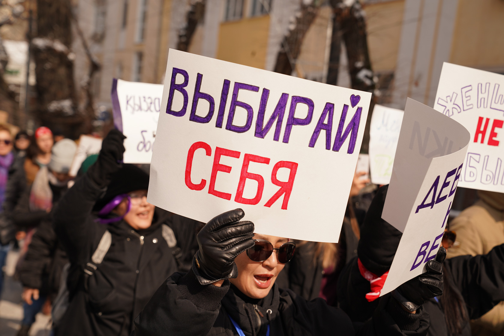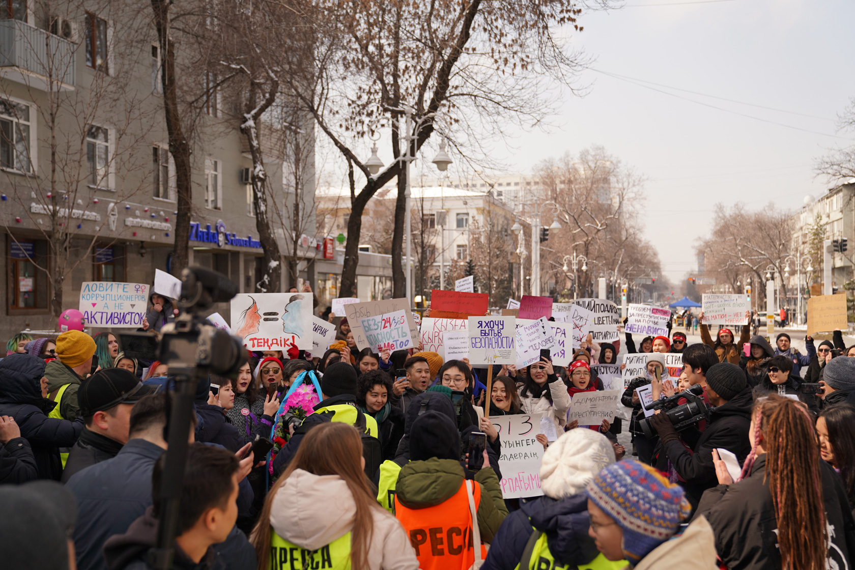 «Сегодня в этот исторический день мы, феминистские инициативы Казахстана: КазФем, Феминита, Фемагора, Фемсреда и общественный фонд "Свет" объединились, чтобы вместе заявить о правах женщин.