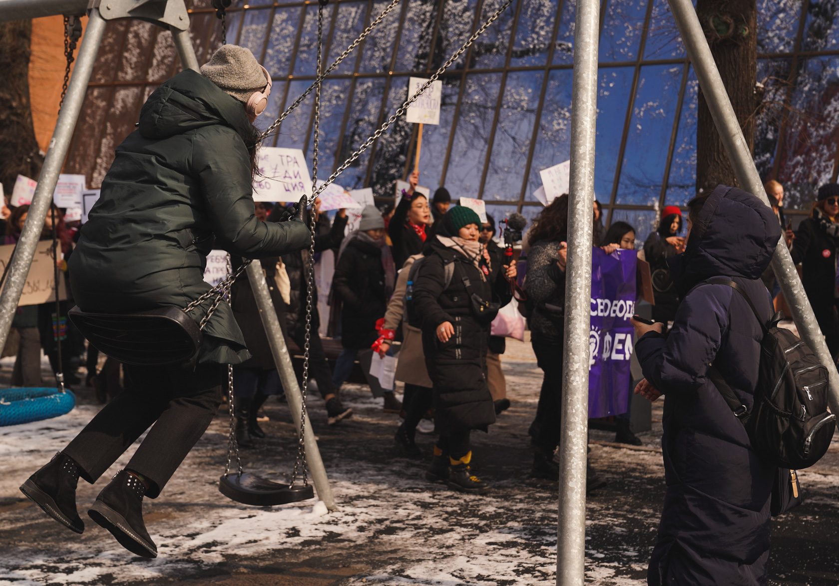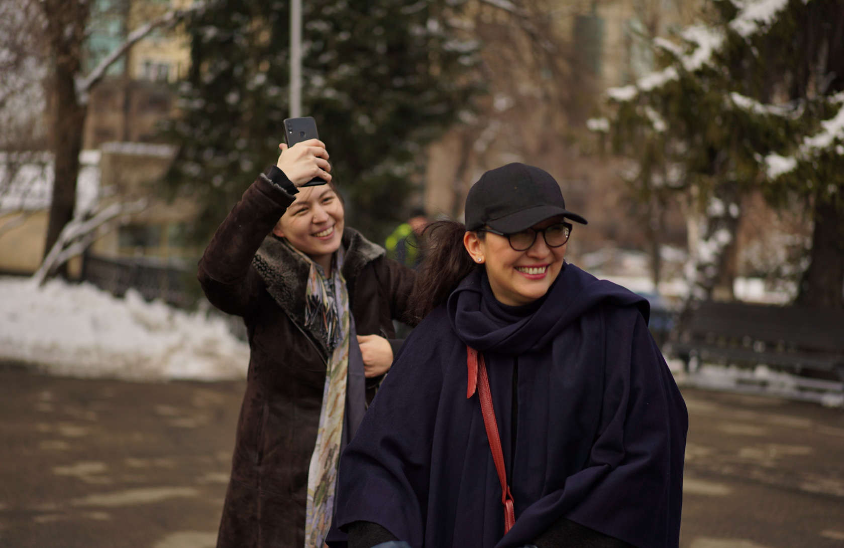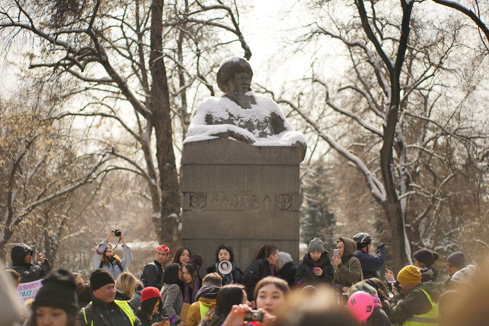 На пересечении улиц Панфилова и Кабанбай батыра колонна остановилась, чтобы хором исполнить песню Джуди Коллинз «Хлеб и розы», ставшую своеобразным гимном феминизма.