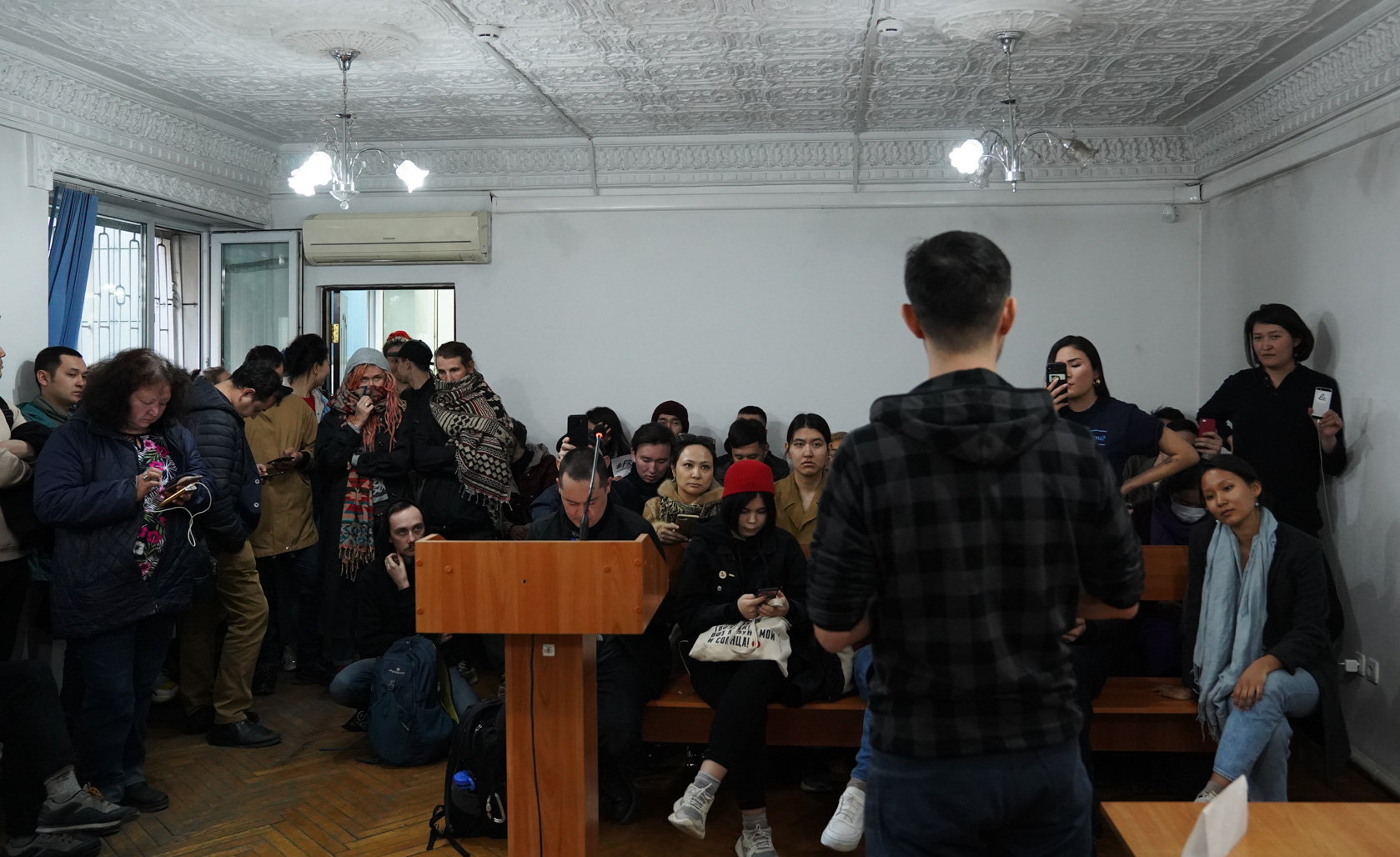 17:10 Из-за дверей слышно, как не попавшие в зал активисты скандируют требования впустить их. Гражданская активистка Ася Тулесова, находящаяся в зале, обращается к судье Мухамеджан Н.М. с просьбой впустить всех, в соответствии с ранее удовлетворенным ходатайством. В ответ судья требует всех присутствующих удалиться.