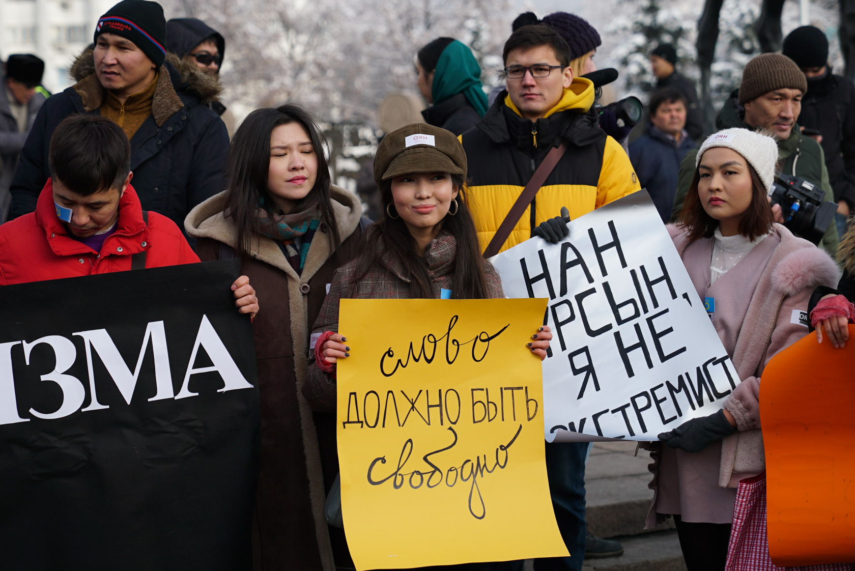 12:00 де Oyan, Qazaqstan қозғалысы белсенділері түрлі слогандар мен тіркестер жазылған плакаттарын көтерді: «От авторитаризма к весне», «Ұмытылмас 1986 2011», «Слово должно быть свободно», «НАН ұрсын, я не экстремист», «Казахстан без Назарбаевых», «Парламентская республика», «Дайте дорогу молодым», «#Ұмытылмас #Желтоқсан #Жаңаөзен», «Наша свобода сильнее всех тюрем» «Хочу, чтобы мой голос что-то значил», «Свободу политзаключенным», «29 лет тирании», «Мафия засыпает, просыпаются мирные граждане», «Көктем жақындап қалды».