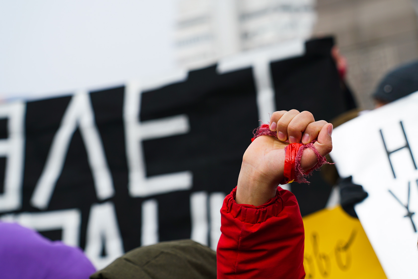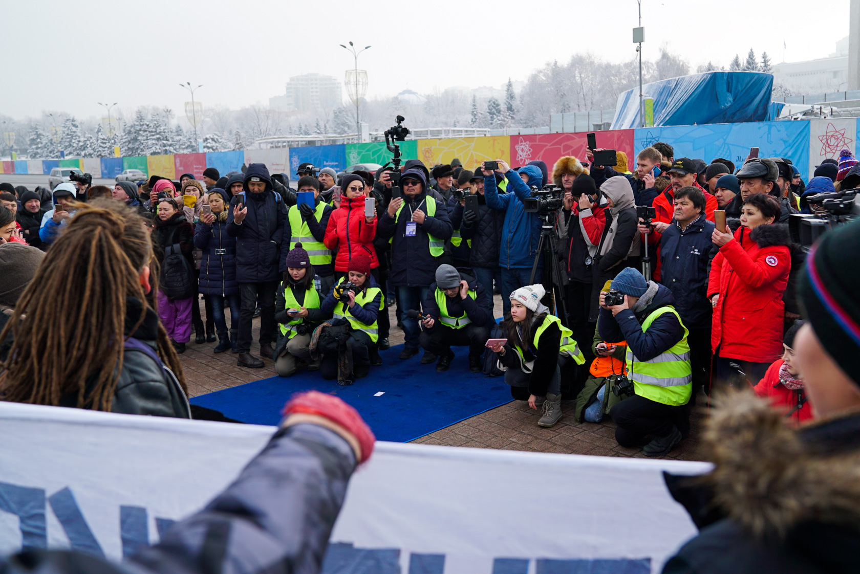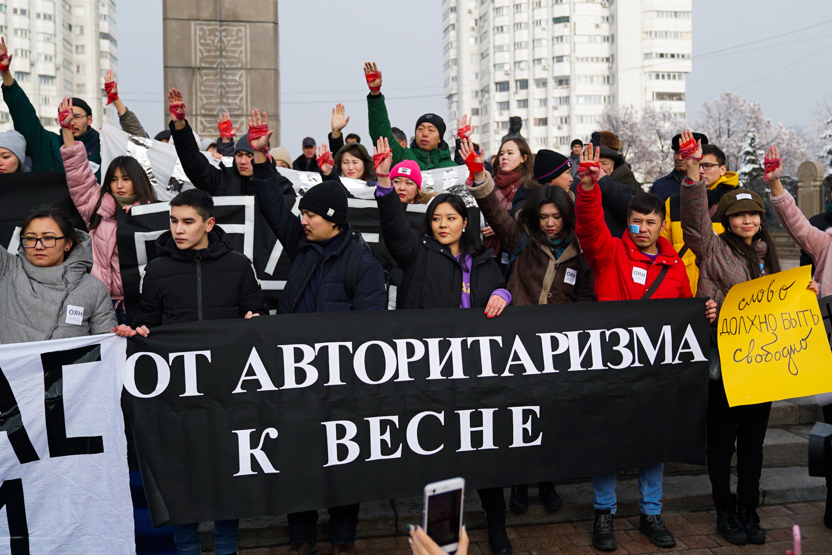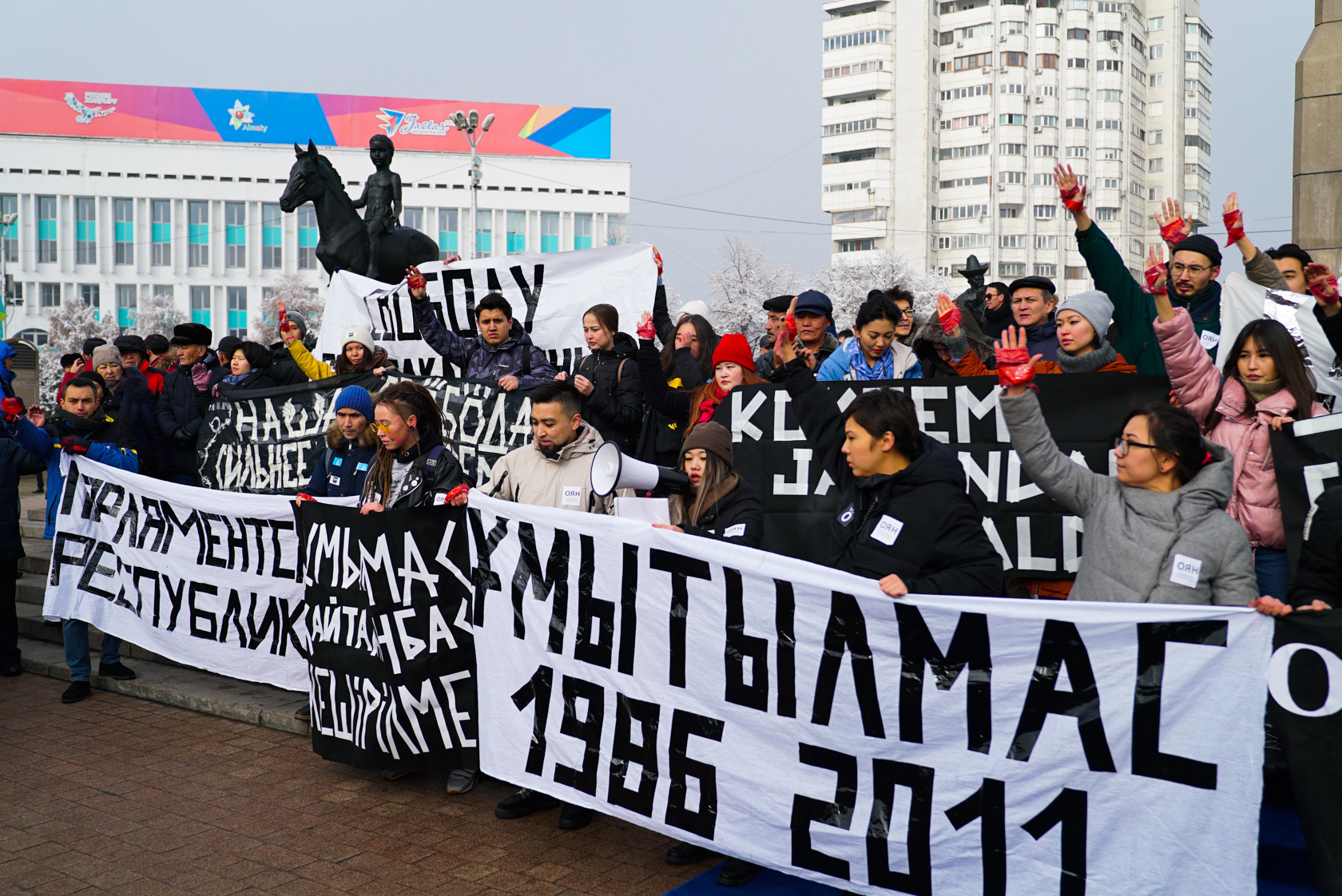 Oyan, Qazaqstan белсенділері плакаттарын ашқаннан кейін қызыл дәке мен таңғыш байлаған оң қолдарын бір мезетте көтеріп арт-акция жасады. Бұл акция 1986 жылғы Алматыдағы Желтоқсан оқиғасы мен 2011 жылы Жаңаөзендегі желтоқсан қанды қырғынында мерт болғандар мен жарақат алғандардың төгілген қанын сипаттады.
