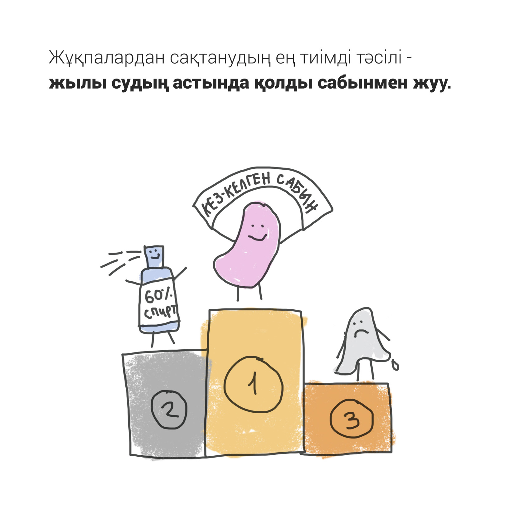 Құрамында спирт бар санитайзерлер вирус пен бактерияларды жақсы жояды. Бірақ спирттің күші 60-70% пайыздан кем болмауы керек.