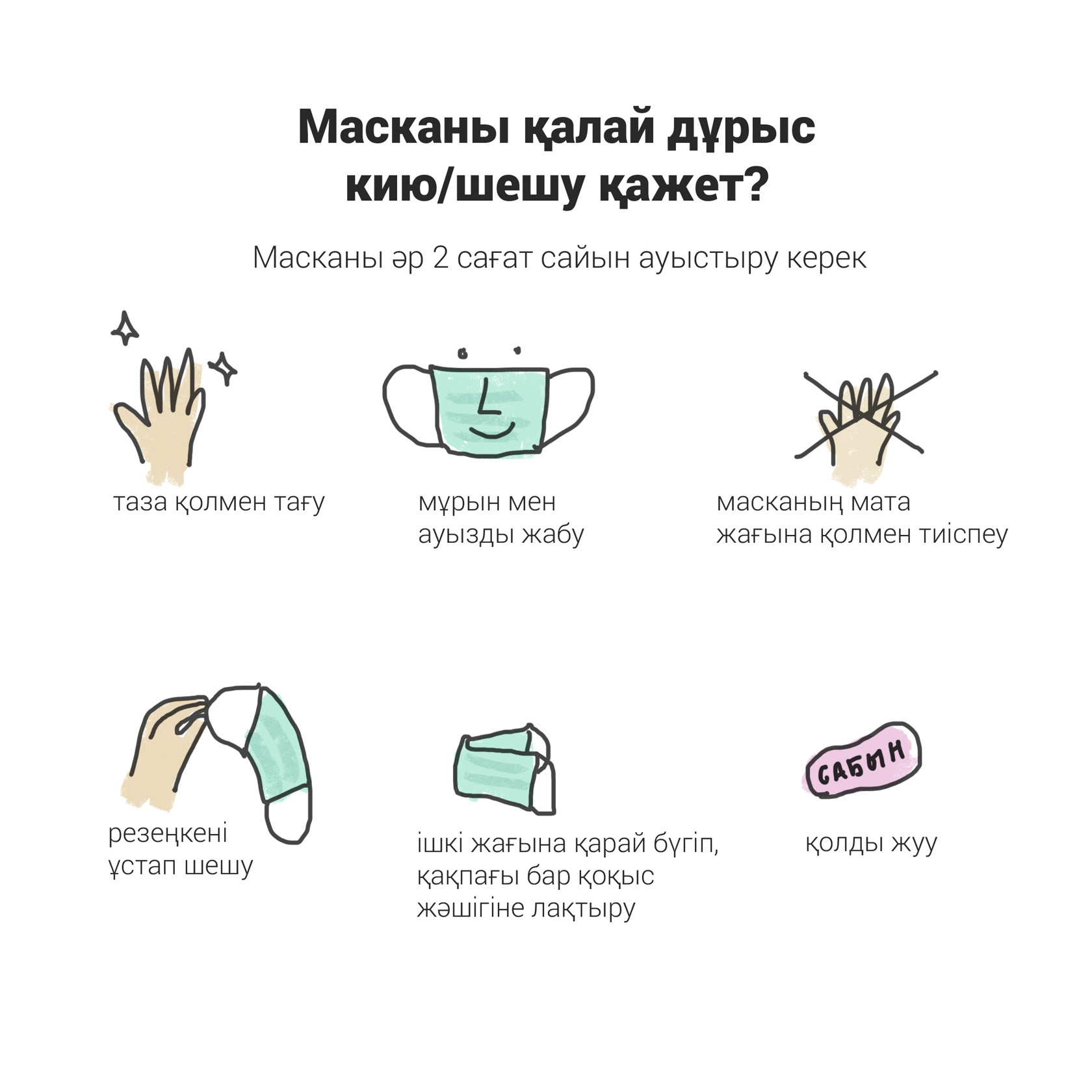 • Масканы киер алдында қолды барлық ережелерді сақтай отырып (төменде оқыңыз) сабындап жуу керек немесе санитайзермен тазалап, сүрткішпен құрғату қажет.