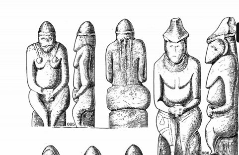 Тарихшы тік тұрған ескерткіштерде әскери элита (және әйелдері), отырған адам ескерткішінде байлар (және әйелдері) бейнеленген деген тұжырымға келеді. Плетнева монографиясындағы суреттерді (суреттердің бәрі анық емес, сондай-ақ тиісті біліктілігім жоқ) талдай келе, отырған ескерткіштерде әйел төсі бейнеленгенін байқауға болады. Бұл символизм қазақ этнографиясы арқылы оңай түсіндіріледі. Мал өсіруші түркілерде әйел сүті, жануар мен жабайы аң сүті қастерленеді. Сүт пен сүт өнімдерінің көп екені молшылық пен гүлденуді білдіреді. Мысалы, бұл молшылықтың нышаны болып жүзден екі жүз литрге дейін көлемдегі, қымыз бен айран даярлайтын, құрт пен сары май жасалатын былғары «саба» есептеледі.