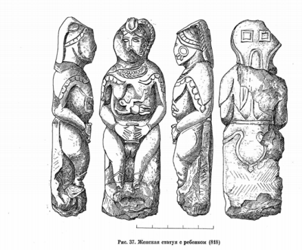 «Әсіресе әйел мен бала ескерткішінде жарылқаушы, күш беруші идея айқын көрінеді. Әйел жалаңаш кеуделі, шалбарсыз (жыныстық сипаттамасы айқын) бейнеленген. Оның кеудесіне руды жалғастырушы нәресте жабысып тұр. Қыпшақ қоғамындағы патриархал жүйеден күтетініміздей, ол нәрестенің жынысы ұл емес, қыз. Мүсіннен әйелдің тікелей ұрпақ жалғастыратын қызға өмір мен күш беріп тұрғанын көреміз. Сондықтан да анасы секілді нәрестенің де жыныс ерекшеліктері айқын көрсетілген. Бұл ескерткіш қыпшақтар, дәлірек айтқанда, құрамындағы рулар руды матриархатқа сәйкес ана жағынан есептеуді ұстанғанын дәлелдейді» (Плетнева: 74). Мыңдаған жыл бұрын ата-бабамыз бұл суреттерді мүлде тұрпайы санамаған. Керісінше дүниеден өткен анасының бейнесін қашап, оны ғибадатһанасына орналастырып, құрбандық шалған. Ең қызығы, ХІХ ғасырға дейін украин және орыс ауылдарында да бұл мүсін табынатын дүние болған. Оларды жуып, ақтап, құрбандық шалып, есесіне қорған мен береке күткен.