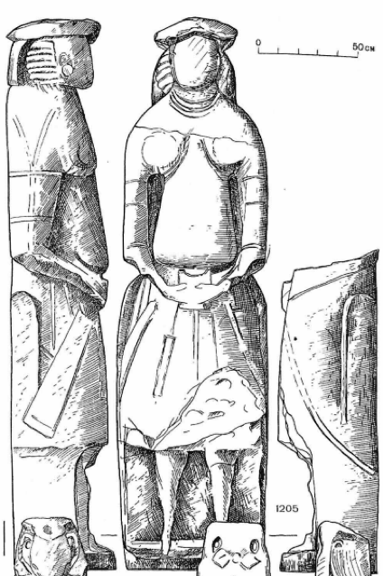 Қыпшақтардың ХІ-ХІІІ ғасырларда кей ер адамдарды әйел төсімен бейнелегені қызық. С. А. Плетнева мұны былай түсіндіреді: «Сол кезеңнің мүсіншілері бейнедегі ер адамның қорған ғана емес, сондай-ақ күш пен байлық сыйлаушы екенін көрсеткісі келіп, оған тән емес дене мүшесін, әйел төсін қосатын болған. Олардың әйел төсі мен толық ер адам төсінің айырмашылығын айқын көрсете білгенін айтпасқа болмас… Әйел мен ер адамның кескіні бірге бейнеленген ескерткіштердің ерекше екені соншалық, зерттеушілер жиі күмәнданады. Бірі мұны әйел ескерткіші деп санап, ер адам сұлбасының ерекшелігін байқамағандай кейіп танытуға тырысса, бірі керісінше шебер сәл қателесіп кеткен ғой, ол шын мәнінде толық ер адамды бейнелегісі келді дейді. Бірінші тұжырымның қате екені айқын. Ескерткіште төс қана болмаса, қалған белгілерінің бәрі ер адамға тән. Олардың басында дулыға немесе далбағай, бетінде мұрт пен сәл-пәл сақал, төсінде айылбас пен белбеу, одан төмен салпаң төс бейнеленген. Ең қызығы - жауынгер әйелдің төсі жинақы екені...» (Плетнева, 74: 74).