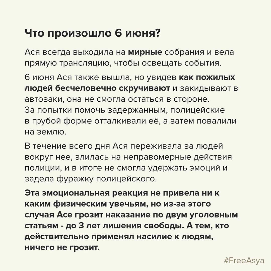 «Что-то изменилось. Не только из-за COVID-19. Что-то очень важное изменилось. Когда мы говорили о деколонизации, предполагалось, что это внутренняя невидимая работа души. Сейчас она стала видимой... А сейчас нашей совести, нашему голосу Асе @miroiu вменяют статью 380 — применение насилия в отношении власти. За то, что она попыталась защитить людей от полиции. Просто остановить насилие.»