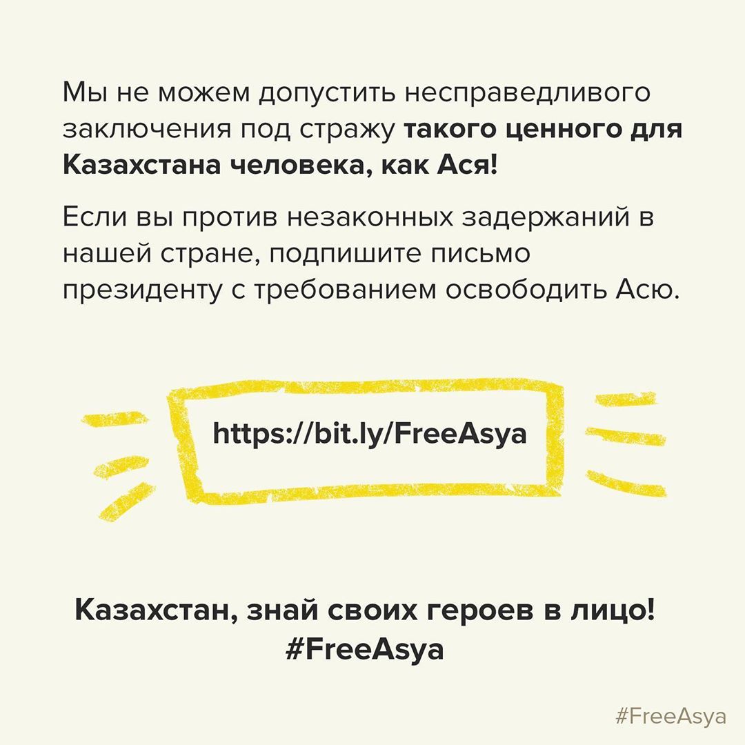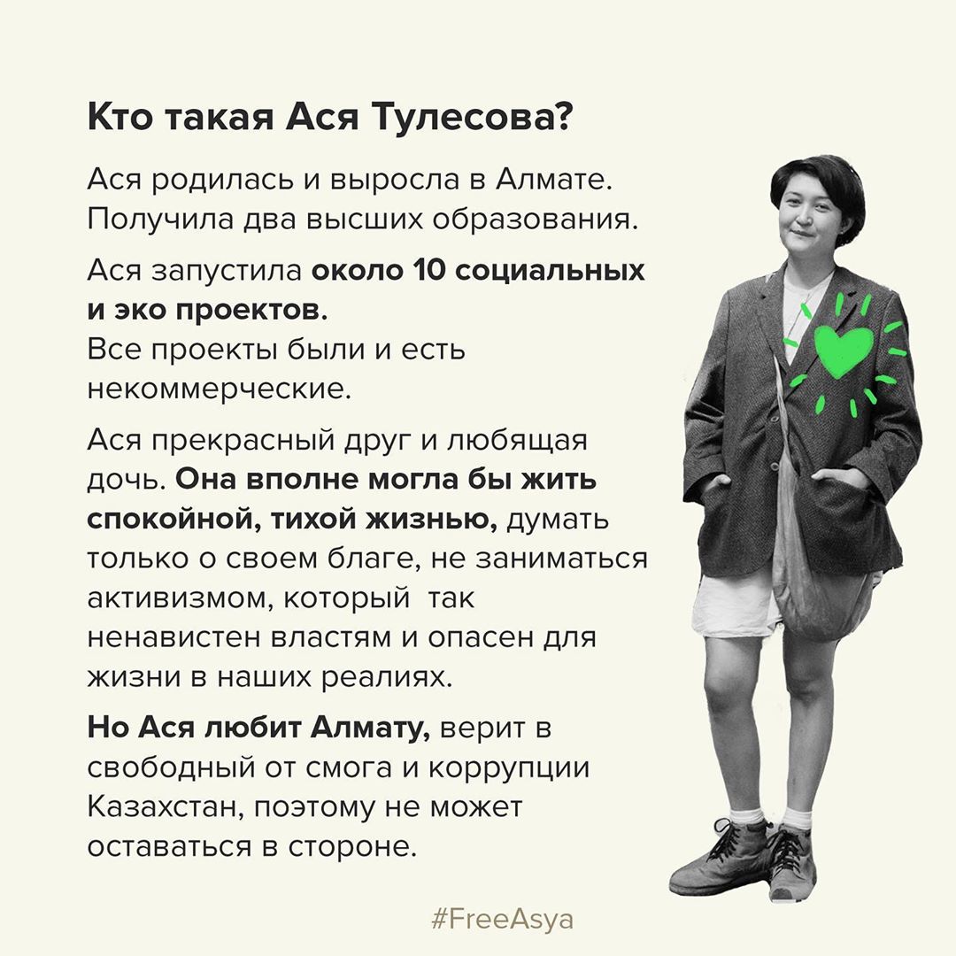 В первые дни после ареста Молодежная информационная служба Казахстана (МИСК) инициировала в социальных сетях кампанию #АсяТакойЧеловек — в противовес фейкам и так называемым «нурботам», старательно очернявшим образ Асии Тулесовой. Под хэштегом друзья и знакомые Аси Тулесовой делились историями, раскрывающими личность активистки. Инстаграм-портал Rukh2k19 выпустил серию картинок, рассказывающих об Асе Тулесовой и ее многочисленных социальных и культурных проектах.