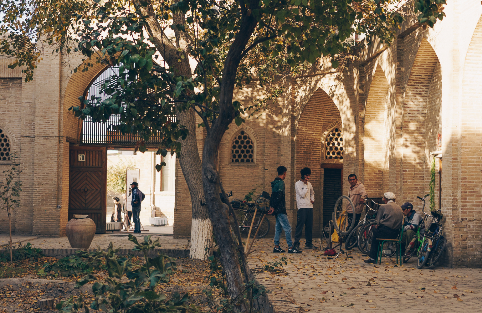Это дворик в одном из бесчисленных караван-сараев в старом городе Бухары: скромный, уютный, свежевымытый. Этот караван-сарай построен около двухсот лет назад. Когда-то здесь наверняка торговали яркими бухарскими коврами, пряностями, сюзане, подставками для книг ляух и всем тем, чем тысячу лет славилась благородная Бухара. Сейчас в этом дворике функционирует точка по прокату велосипедов, галерея наивного искусства и фотоцентр — вероятно, старейший не только в Узбекистане, но и во всей Центральной Азии.