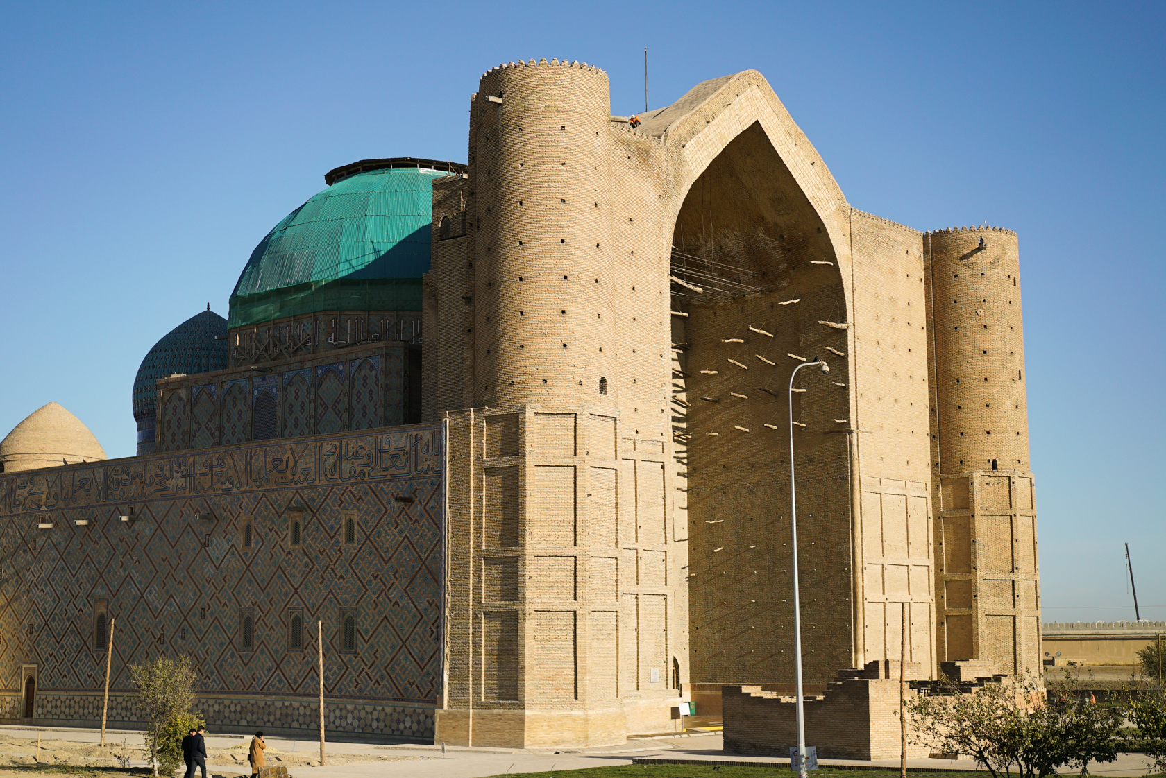 А ханака в Туркестане действительно уникальная: это не только первый по времени крупный шедевр тимуридской архитектуры. Это единственное здание среди памятников эпохи эмира Тимура, которое почти полностью сохранилось в первозданном виде. Соборная мечеть Биби-Ханым в Самарканде, строительство которой началось на 14 лет позже и которая сравнима с Хазрет Султаном по размерам, разрушилась без военных действий, в результате естественных причин. Как обтекаемо написано в Википедии: «частично восстановлена из руин в конце XX века».