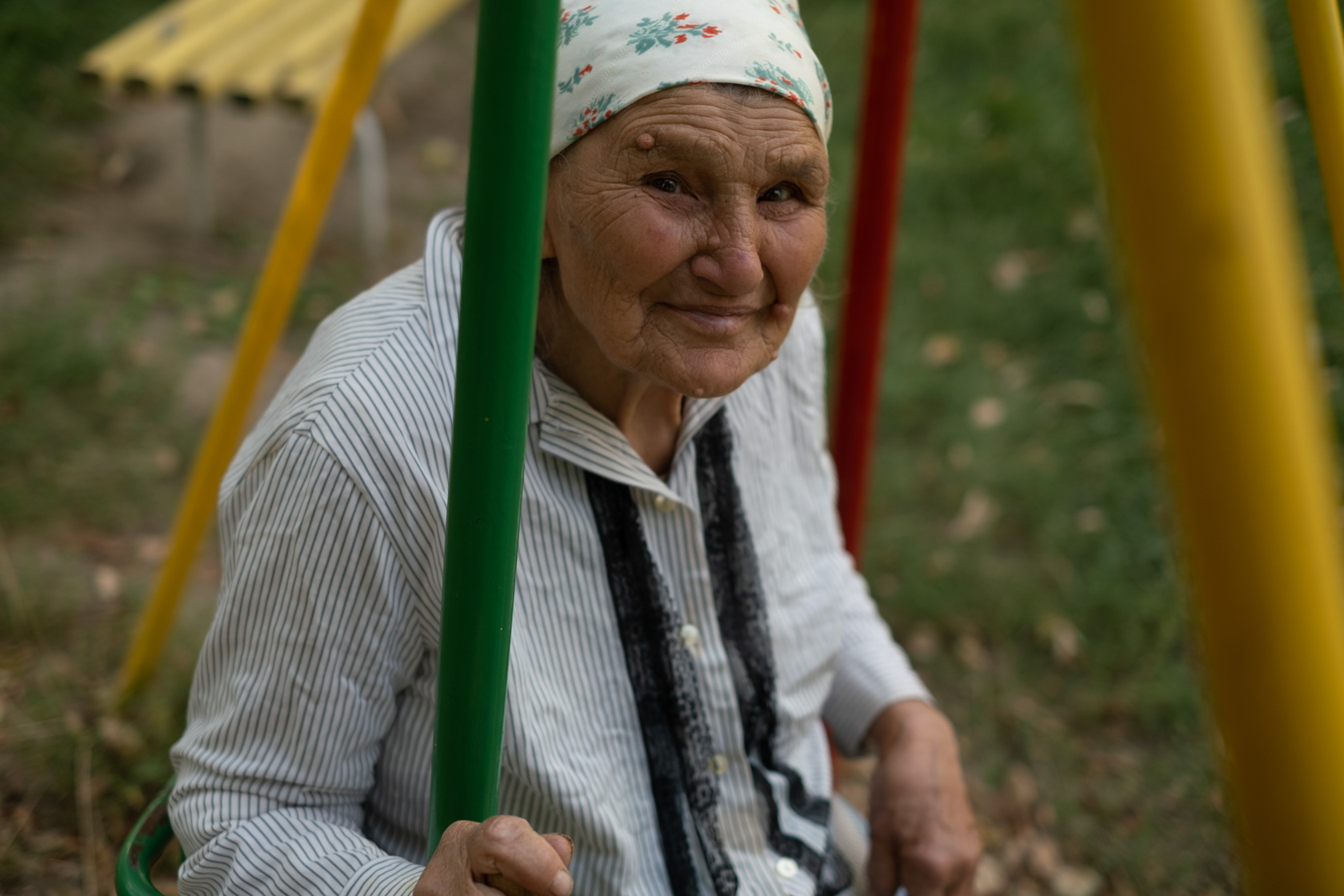 Проходя возле детских качелей, Виктория знакомит нас с 90-летней бабушкой Галиной, которая на них качается: «А это наш волонтер по созданию прекрасного настроения, постоянно нам в волонтерский центр приносит цветы, которые сама вырастила».