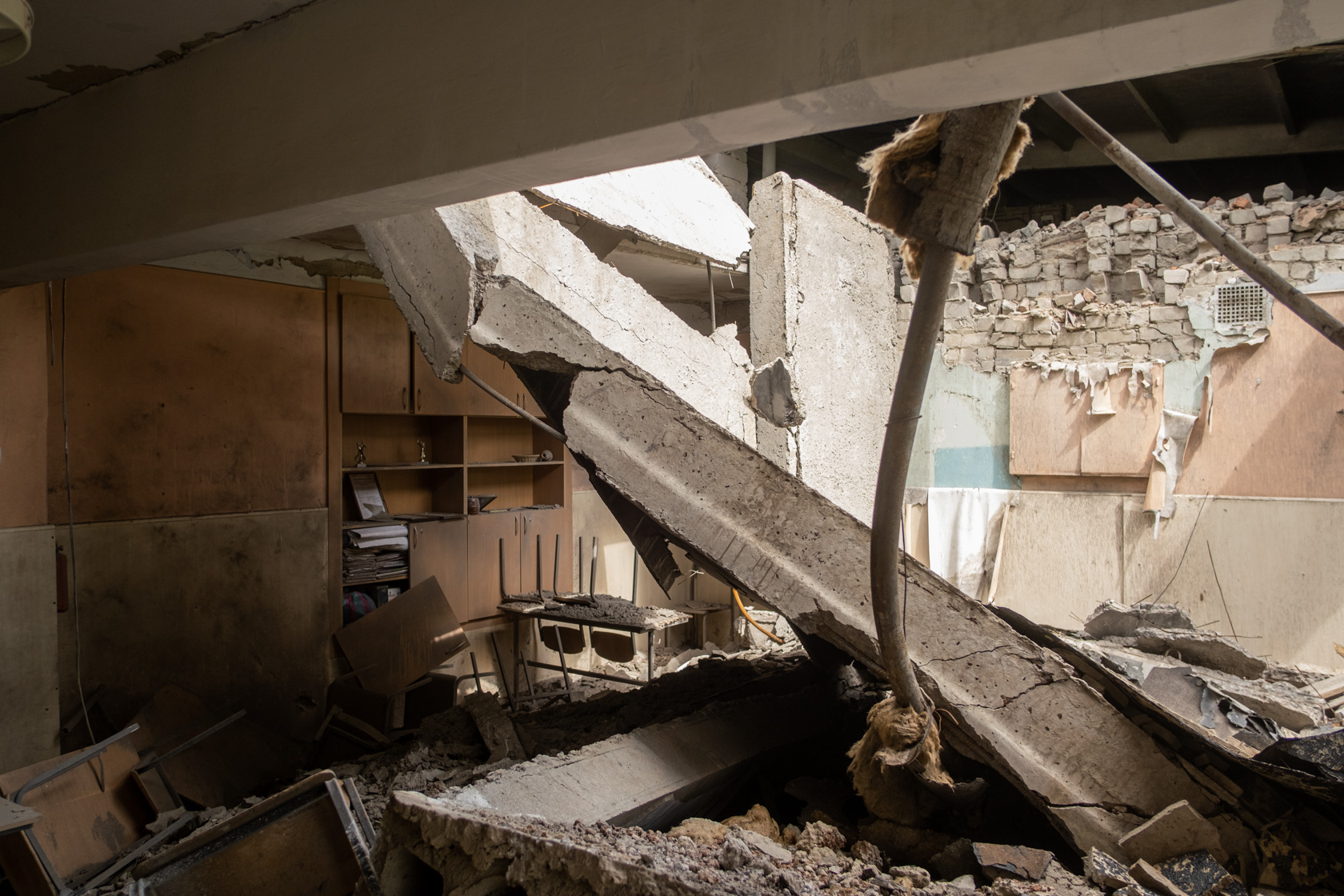 Волонтеры Сергей и Виталий проводят нас по коридорам школы: до войны это была одна из лучших школ в Харькове. Началась война, и по школе ударили российские артиллерийские снаряды. Зайдя в раздевалку, Сергей находит розовую спортивную сумочку своего ребенка.
