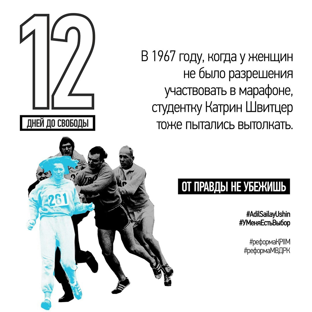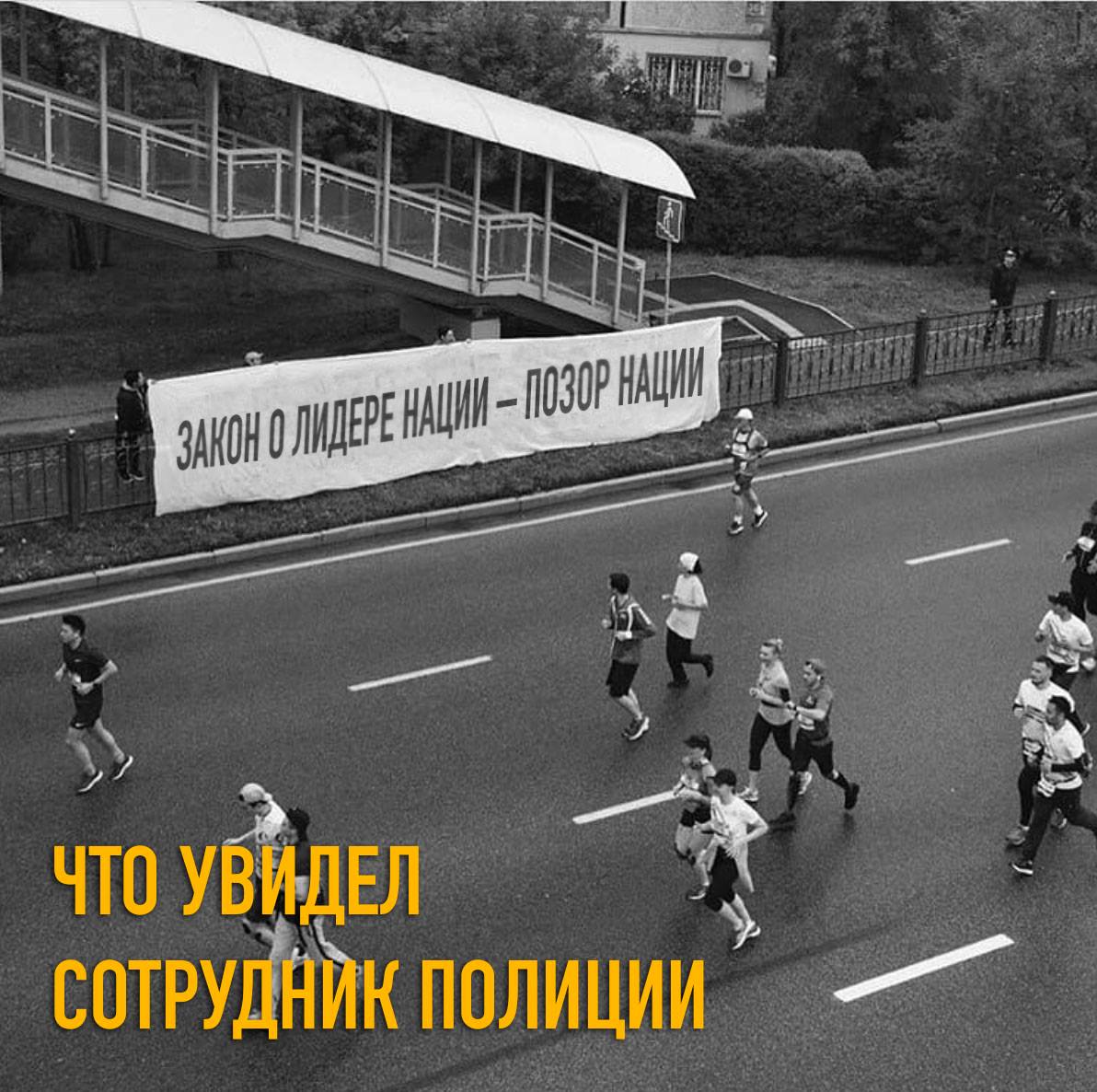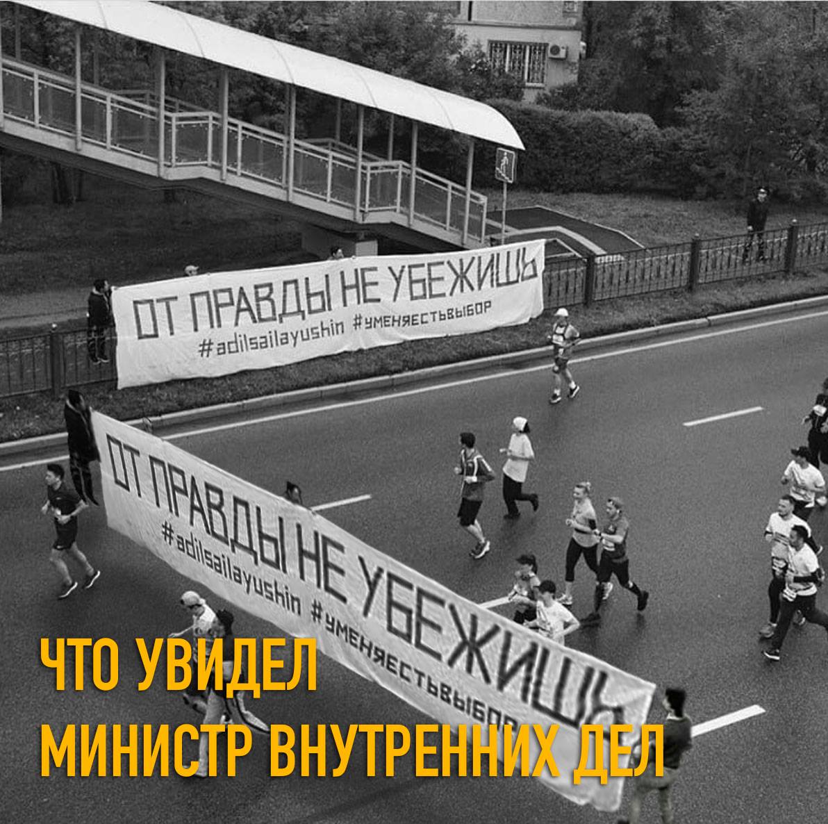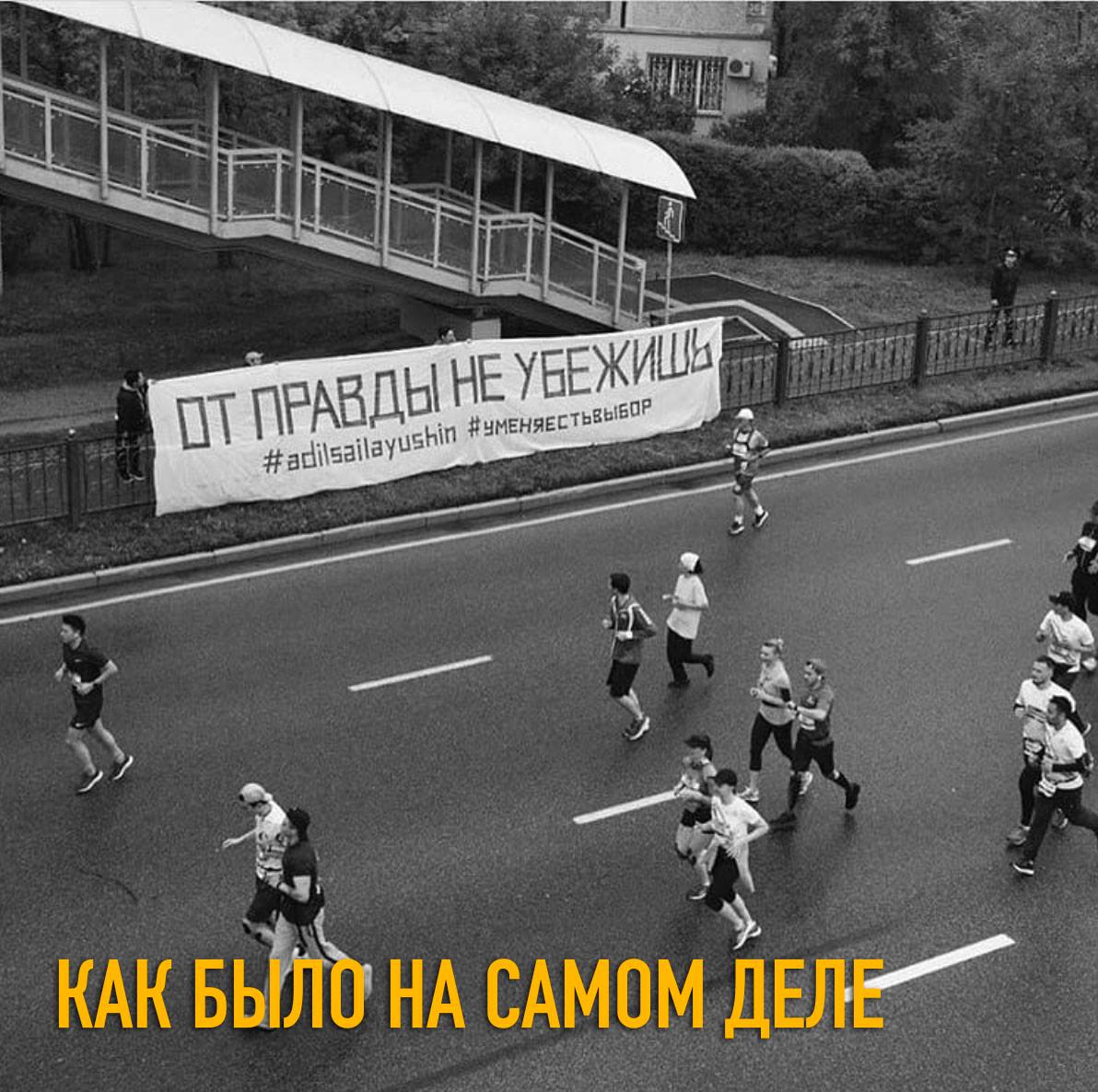 21 апреля за демонстрацию на алматинском марафоне баннера со словами «ОТ ПРАВДЫ НЕ УБЕЖИШЬ» и подписями #AdilSailayUshin («За честные выборы») и #уменяестьвыбор полицией были задержаны гражданские активисты Асия Тулесова и Бейбарыс Толымбеков. В тот же вечер состоялся суд, где А. Тулесову и Б. Толымбекова признали виновными по административной статье 488, ч. 3 и вынесли приговор каждому из них — 15 суток ареста. На следующий день к суду были привлечены кинооператоры, снимавшие на видео процесс разворачивания плаката и ареста активистов: Суинбике Сулейменова, Айгуль и Айдос Нурболатовы. Всех троих суд также признал виновными и подверг административным взысканиям в виде штрафа.