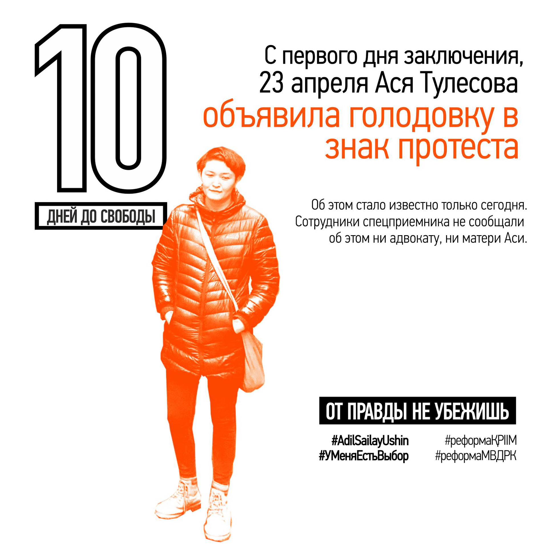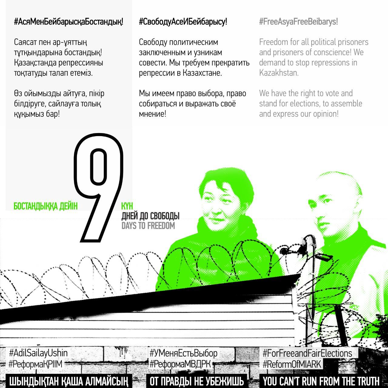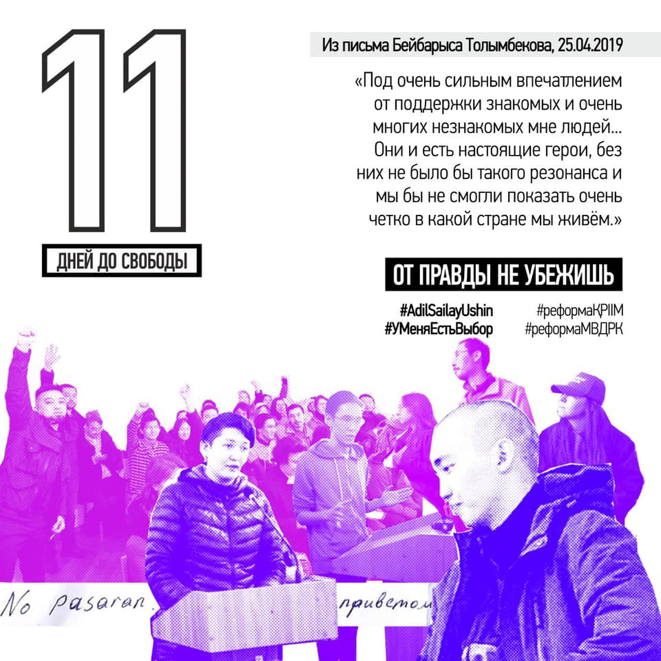 21 апреля за демонстрацию на алматинском марафоне баннера со словами «ОТ ПРАВДЫ НЕ УБЕЖИШЬ» и подписями #AdilSailayUshin («За честные выборы») и #уменяестьвыбор полицией были задержаны гражданские активисты Асия Тулесова и Бейбарыс Толымбеков. В тот же вечер состоялся суд, где А. Тулесову и Б. Толымбекова признали виновными по административной статье 488, ч. 3 и вынесли приговор каждому из них — 15 суток ареста. На следующий день к суду были привлечены кинооператоры, снимавшие на видео процесс разворачивания плаката и ареста активистов: Суинбике Сулейменова, Айгуль и Айдос Нурболатовы. Всех троих суд также признал виновными и подверг административным взысканиям в виде штрафа.