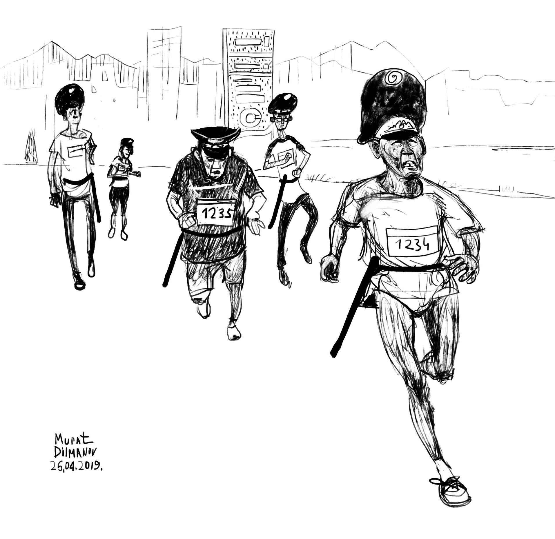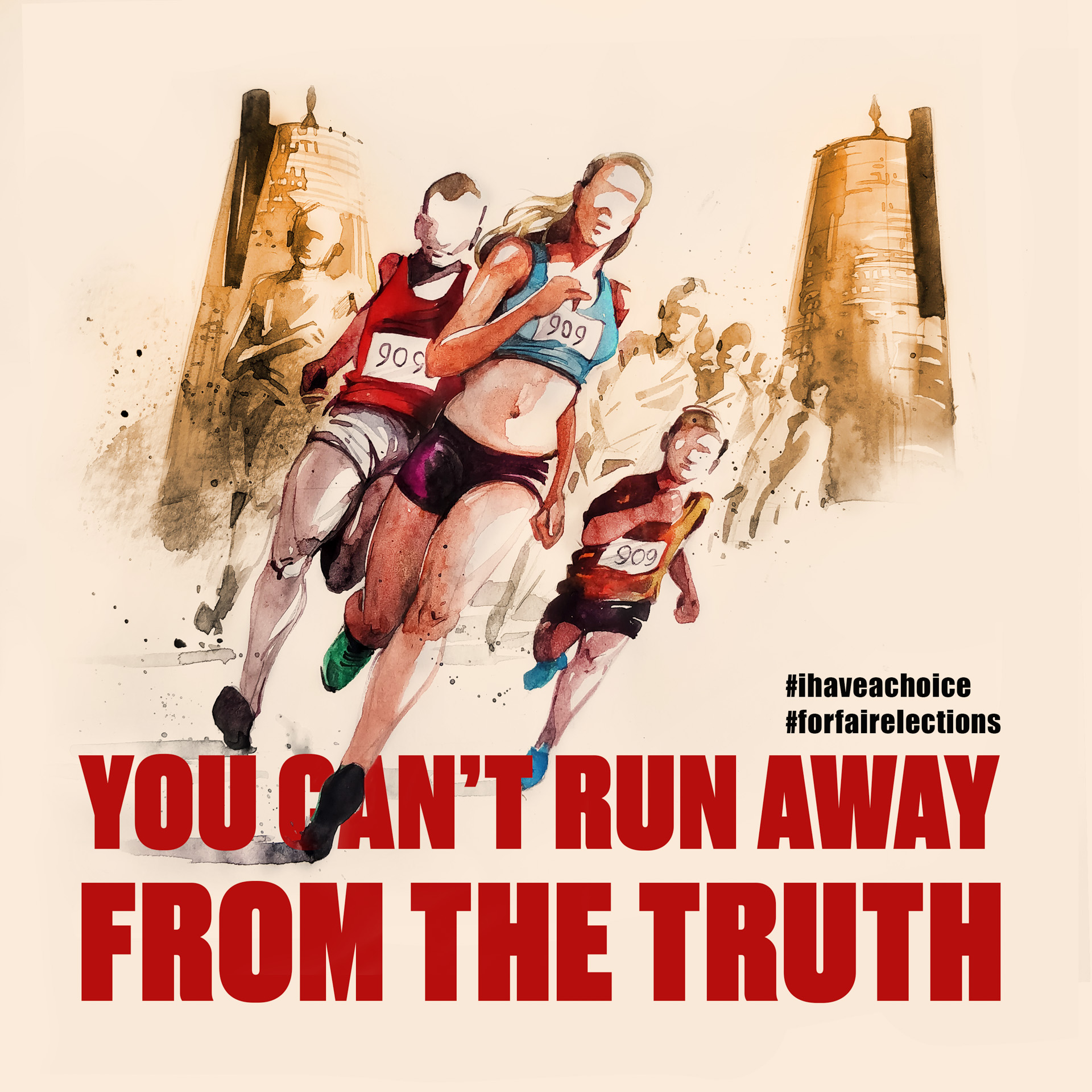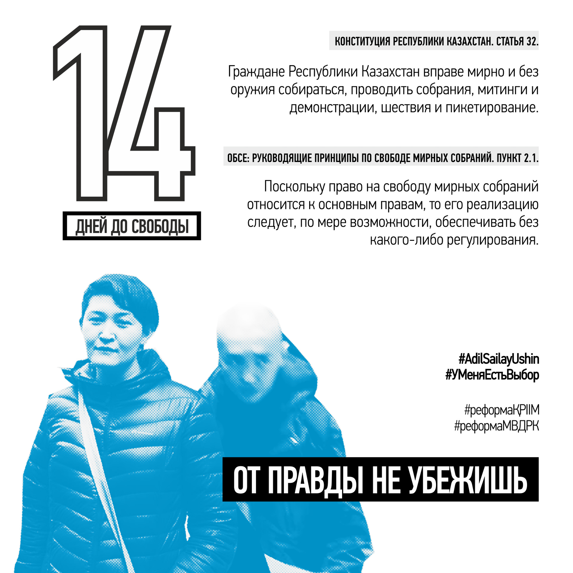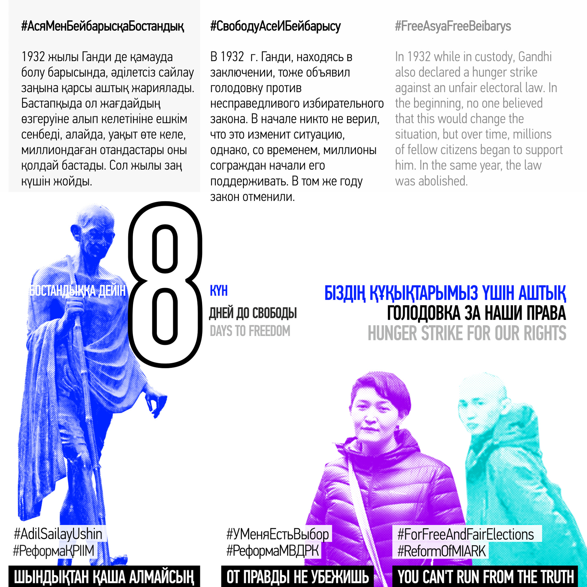 21 апреля за демонстрацию на алматинском марафоне баннера со словами «ОТ ПРАВДЫ НЕ УБЕЖИШЬ» и подписями #AdilSailayUshin («За честные выборы») и #уменяестьвыбор полицией были задержаны гражданские активисты Асия Тулесова и Бейбарыс Толымбеков. В тот же вечер состоялся суд, где А. Тулесову и Б. Толымбекова признали виновными по административной статье 488, ч. 3 и вынесли приговор каждому из них — 15 суток ареста. На следующий день к суду были привлечены кинооператоры, снимавшие на видео процесс разворачивания плаката и ареста активистов: Суинбике Сулейменова, Айгуль и Айдос Нурболатовы. Всех троих суд также признал виновными и подверг административным взысканиям в виде штрафа.