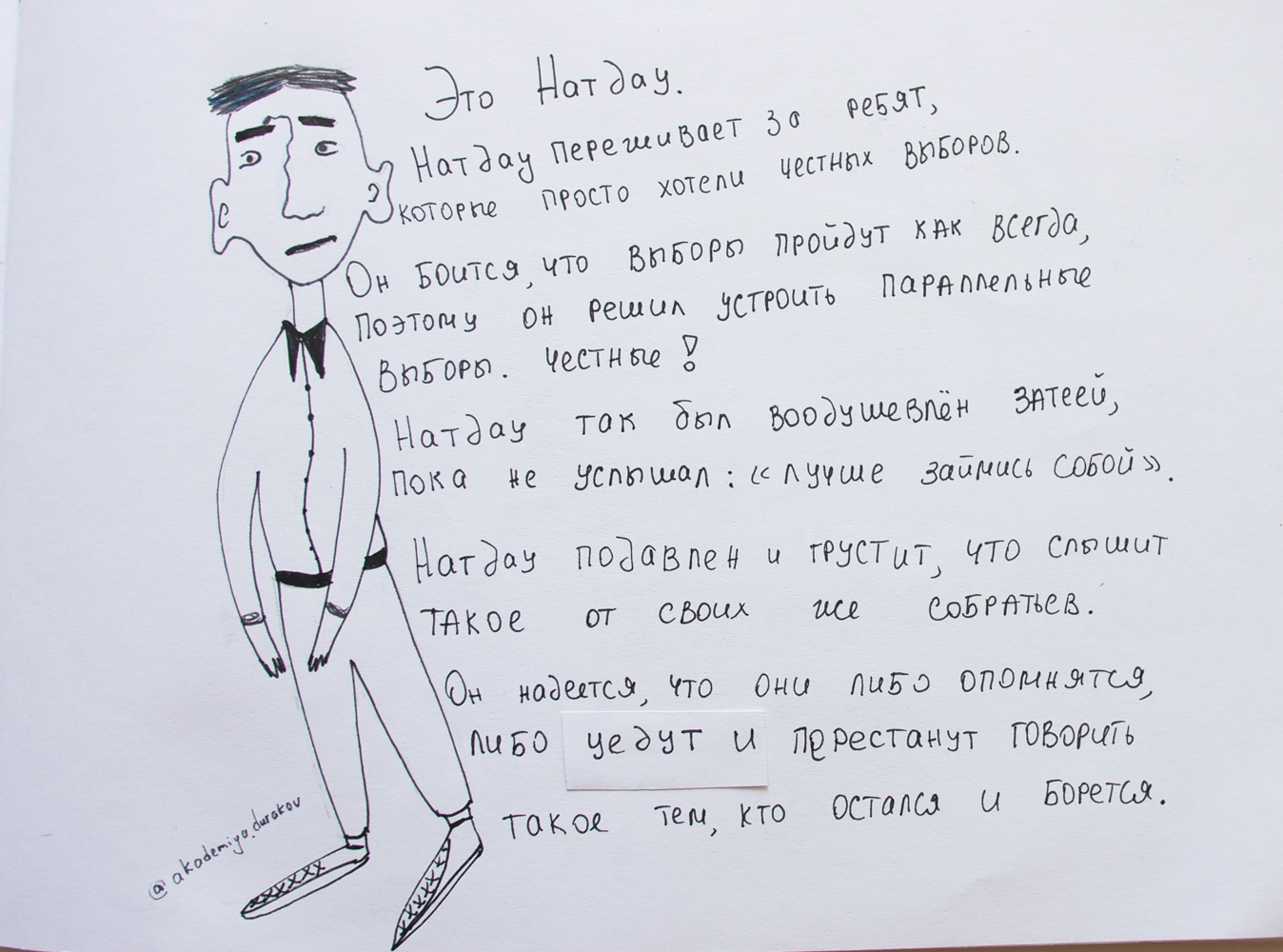 Когда я узнал о событиях в Казахстане, мне захотелось скорее сделать иллюстрацию на тему и поведать миру и произошедшем. То, что произошло 21 апреля 2019 года, не должно происходить нигде в мире. Когда молодое поколение становится более осведомленным в вопросах политики, это знание необходимо распространять. Это наша ответственность как людей — добиваться лучшей жизни в собственных странах. Как дизайнер и как человек, я поддерживаю девушку Асю всем сердцем.