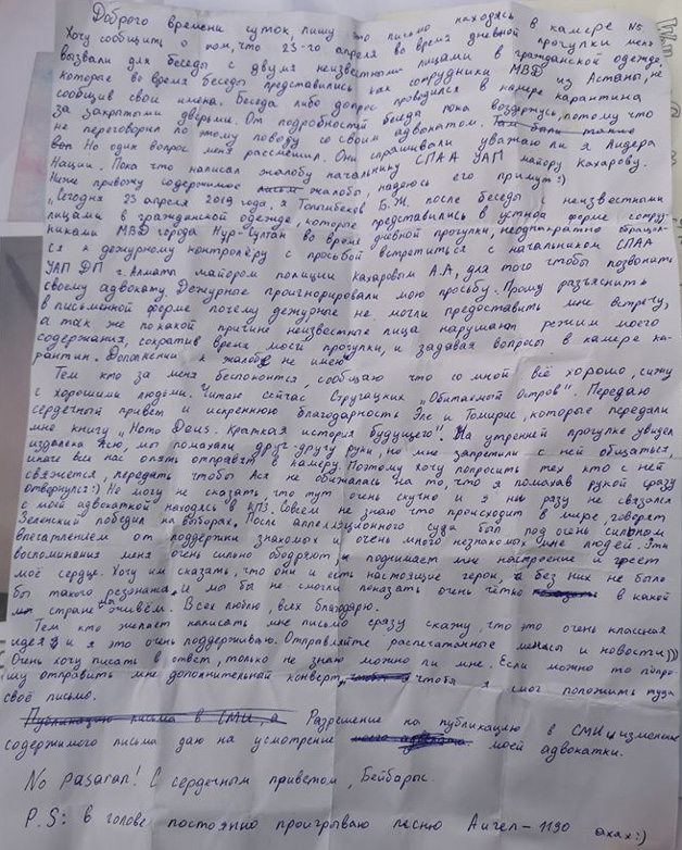 На днях в социальных сетях были опубликованы и письма Асии Тулесовой и Бейбарыса Толымбекова из заключения.